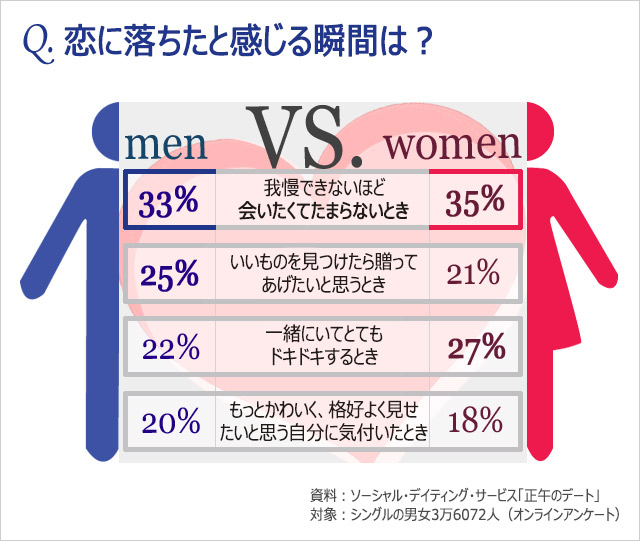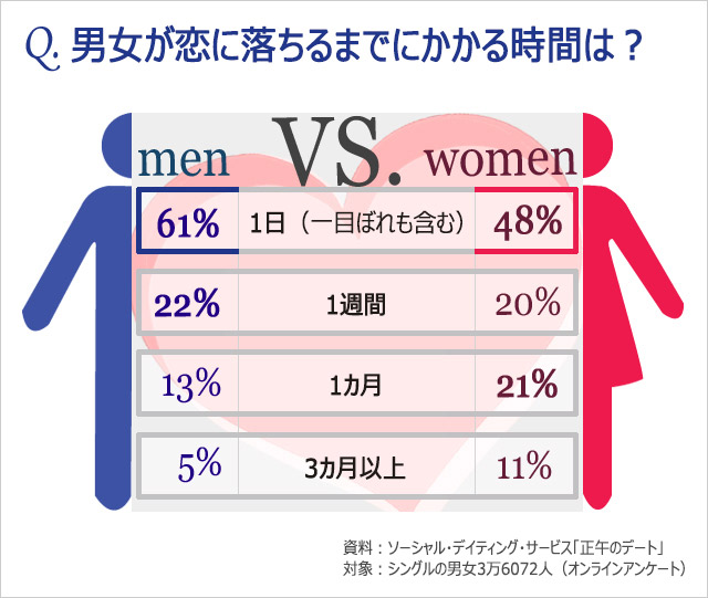 男女が恋に落ちるまでにかかる時間はどれくらいだろう。徐々に魅かれていく人がいれば、初めて会った瞬間に恋に落ちる人もいる。では、未婚の男女はいつ相手に好意を持つようになるのだろうか。恋に落ちるまでにかかる時間、恋に落ちたと感じる瞬間を見てみよう。