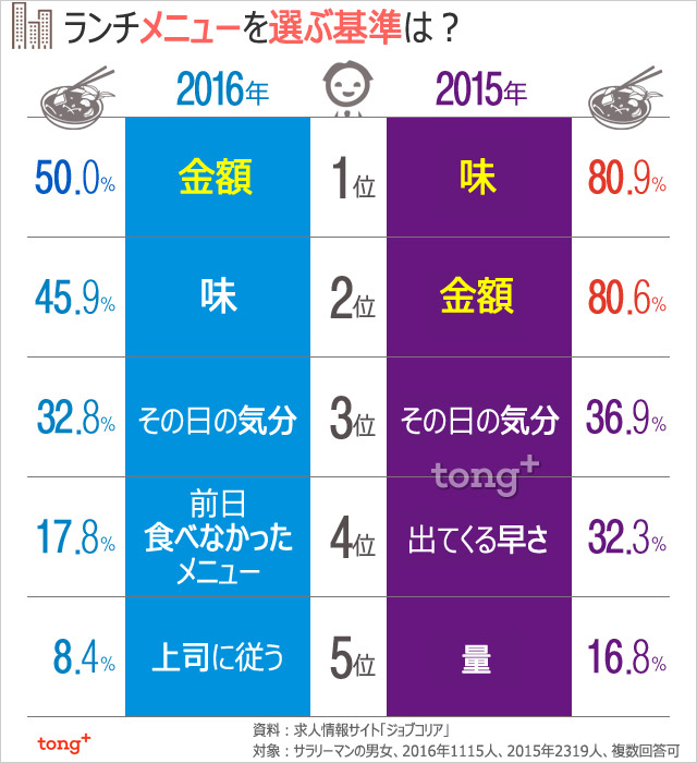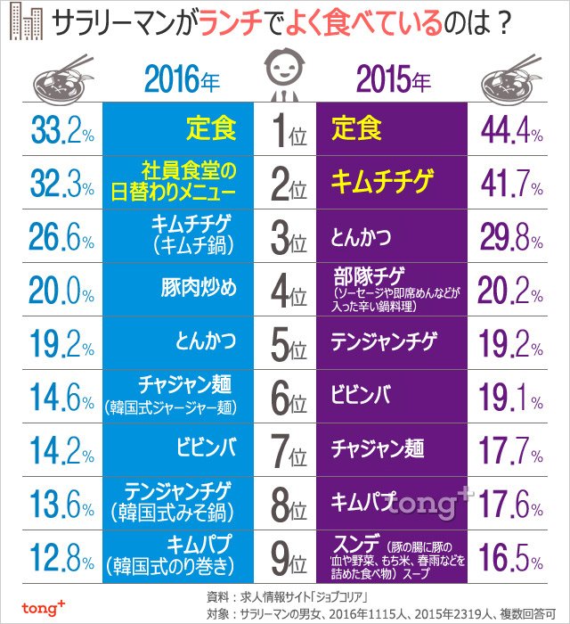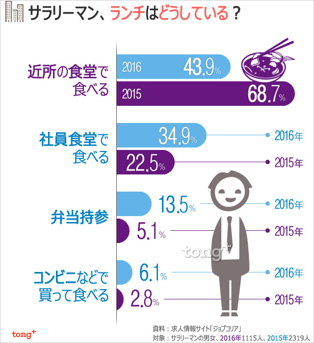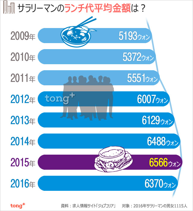 2016年の韓国のサラリーマンのランチ代は平均6370ウォン(約630円)で、前年(6566ウォン=約650円)に比べ3%下がった。これは、お財布事情が厳しいサラリーマンたちが家から弁当を持参したり、コンビニエンスストアなどで購入して食べるケースが増えていることが影響している。サラリーマンに好きなランチメニューを尋ねたところ、家庭料理を思わせる定食を挙げる人が多かった。では、サラリーマンのランチ代の推移とメニューの実態を見てみよう。