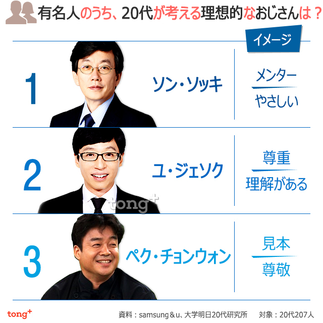 有名人のうち、20代が考える理想的なおじさん1位は、やさしい性格で、多くの人が信頼するメンター的なニュースキャスターのソン・ソッキが選ばれた。続いて2位は理解があり、ほかの人を尊重してくれるタレントのユ・ジェソク、3位は外食業界で成功を収めた最高経営責任者(CEO)であり、簡単なレシピの紹介や親しみのある話し方でテレビでも人気を集め、尊敬されている料理研究家ペク・チョンウォンだった。