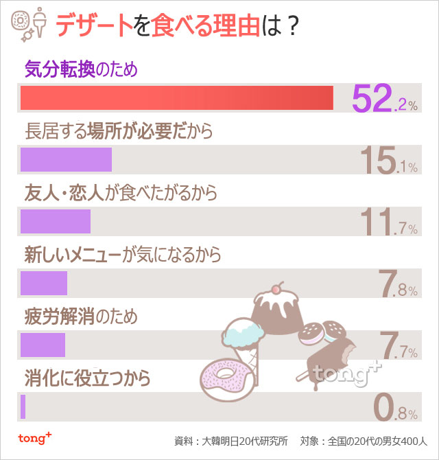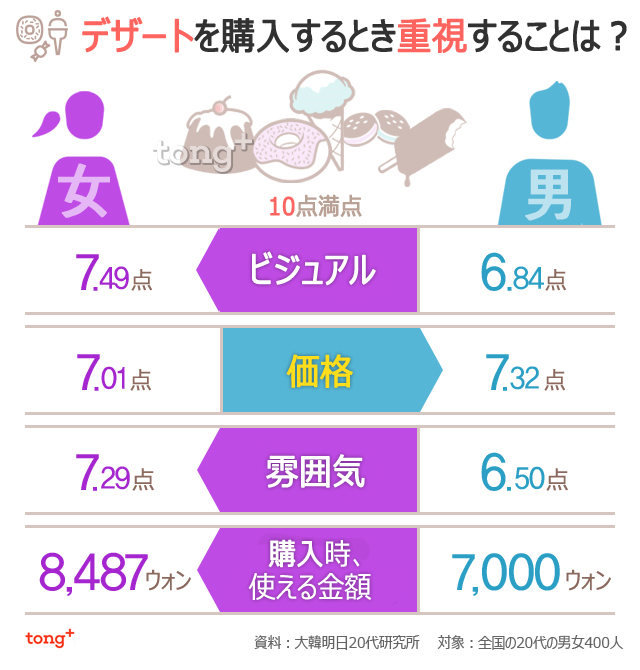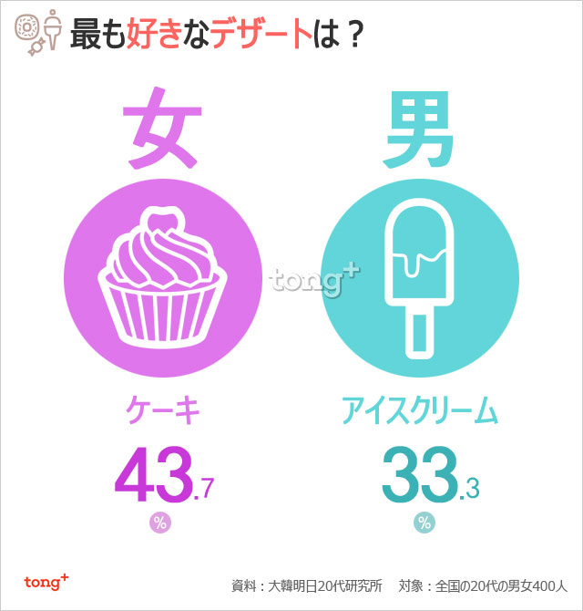「小さなぜいたく」と言われるデザート。20代の男女が最も好むデザートは何だろうか。男性の33%がアイスクリームを、女性の43.7%がケーキを挙げた。デザートを購入するとき重視することや価格など、20代の男女のデザートに対する考え方をまとめてみた。