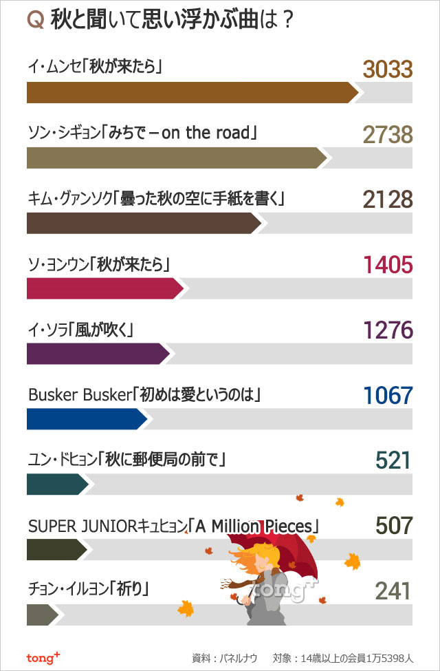 秋と聞いて思い浮かぶ曲を尋ねたところ、1位はイ・ムンセの「秋が来たら」だった。