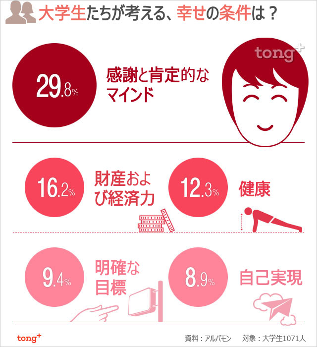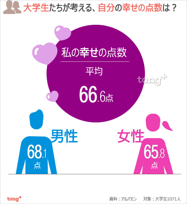 若者の失業など不況が長引き、大学生たちが心理的に感じる「心の温度」はマイナス17.3度まで下がっていることが分かった。では、自分の幸せに点数を付けるとしたら何点になるのだろうか。大学生たちが考える自分の幸せの点数、幸せの条件を見てみよう。