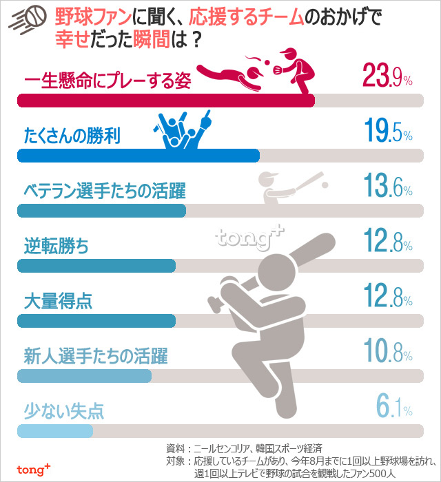 野球は韓国で人気のスポーツの一つで、ファン層が広く多様だ。野球の人気が高まったことで、野球を楽しむ方法も多様化し、シーズン中には自分が応援するチームのために泣いたり笑ったりする日々を過ごす人も多い。では、野球ファンが応援するチームのおかげで幸せだった瞬間はいつか、野球場で感じることができる楽しみのうち欠かせないグルメや応援文化は何か、見てみよう。