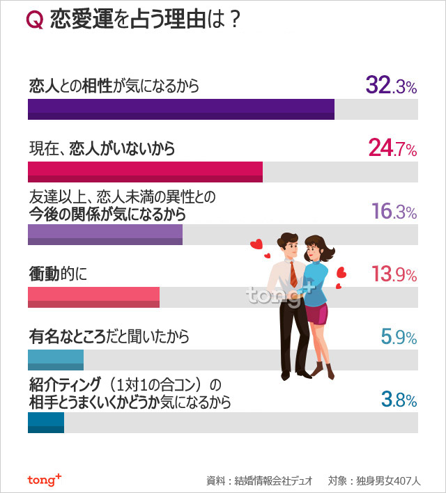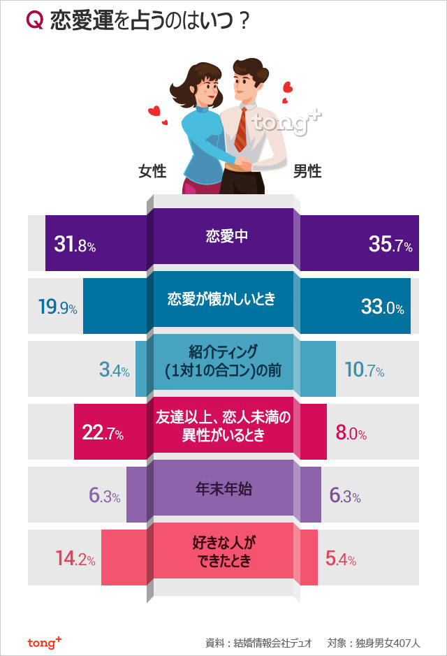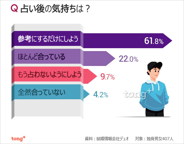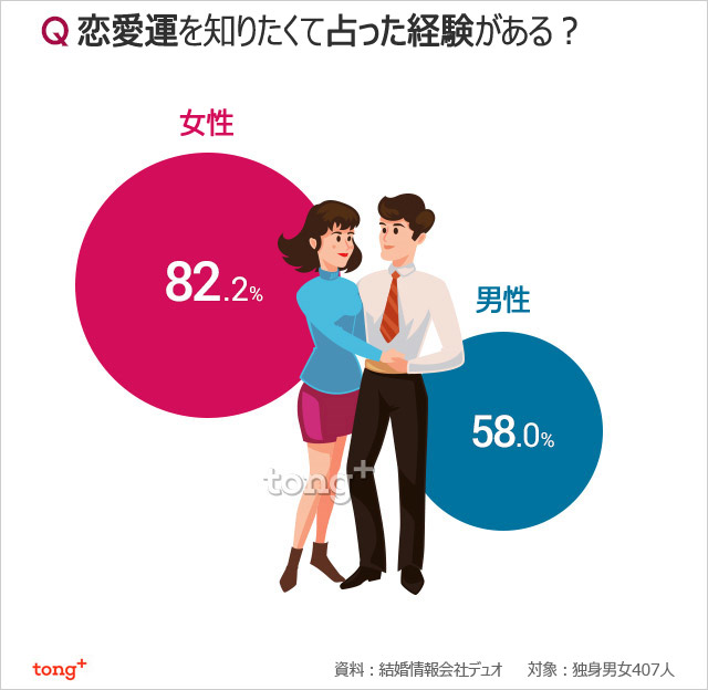 独身男女の10人に7人が、恋愛運が気になって占ったことがあることが分かった。また、男女とも恋愛中に最もよく占うという。では、恋愛運を占う理由、占い後の気持ちなど、恋愛運占いに関するアンケートの結果を見てみよう。