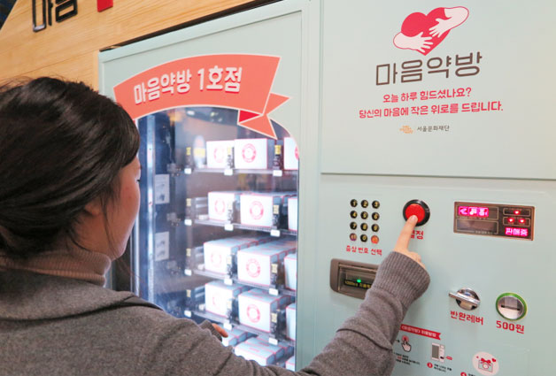 「心の薬房」という名の自動販売機がある。この自動販売機は、スマートフォン中毒など、懸念される現代病を選択すると、該当の病気に関する処方カードが出てくる。症状によって、心を癒してくれるメッセージとともに映画や絵画などを勧めてくれるのだが、処方箋と一緒にユーモアを交えた小さなプレゼントが入っているのが面白い。