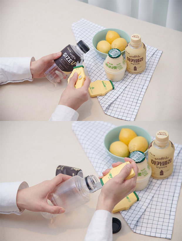 分バスティックとは、「分離排出が簡単になるバナナ味牛乳スティック」という意味で、刃を使ってペットボトルについているラベルやキャップリングを手軽に片づけられるアイデア商品だ。