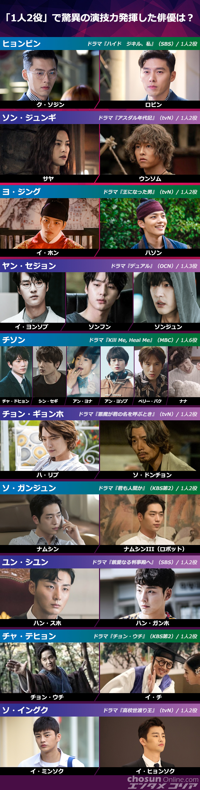 ソン・ジュンギ、チソン、ヨ・ジングのほかにどんな俳優たちがどんな作品でまったく違う登場人物を演じ分けたのか、以下に取り上げてみた。