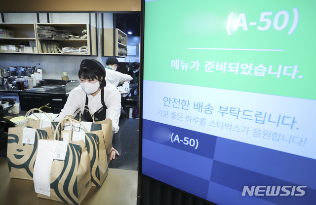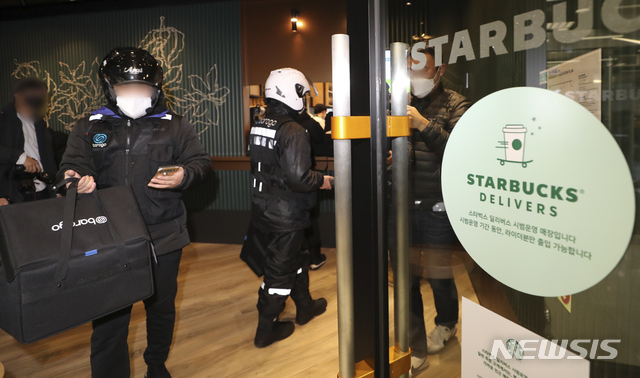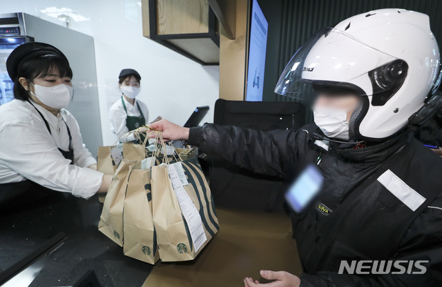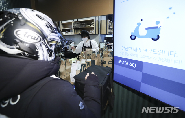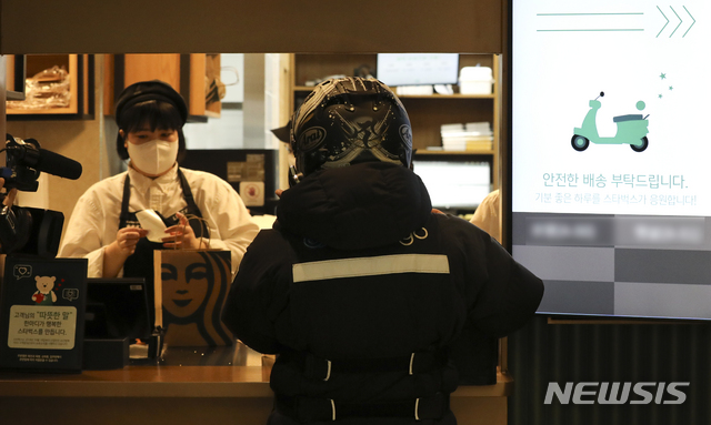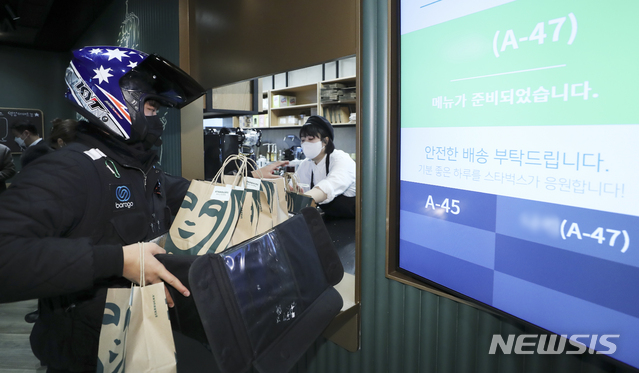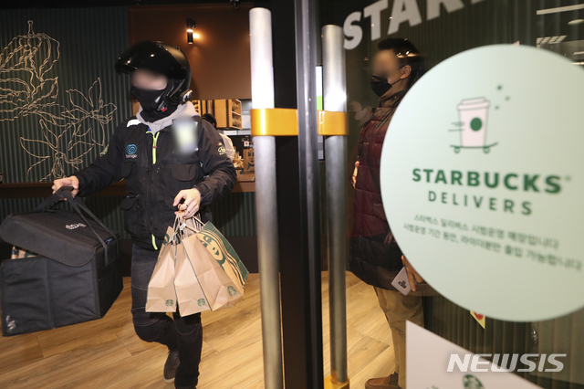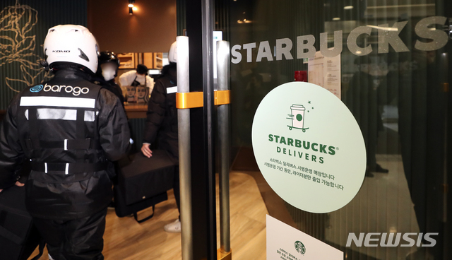 STARBUCKS COFFEEによる配達サービスの試験運営が始まった27日、ソウル市江南区の配達専用売り場の駅三イーマート店では、注文が入ったドリンクを配達するため、バイク便のドライバーが商品を受け取っていた。