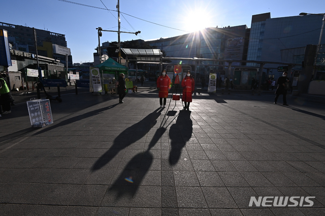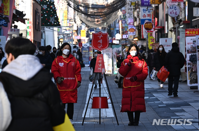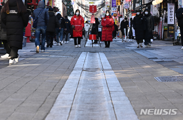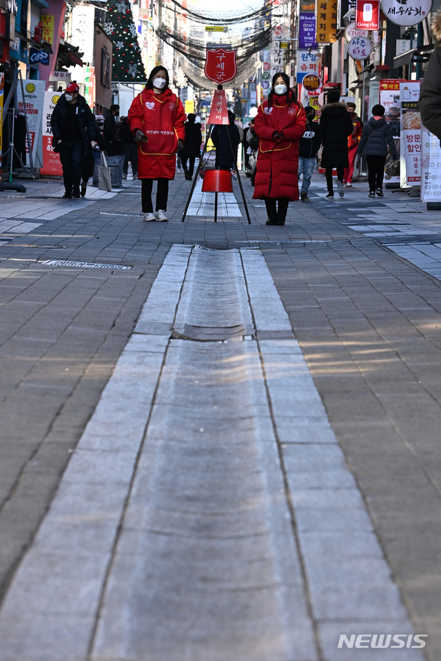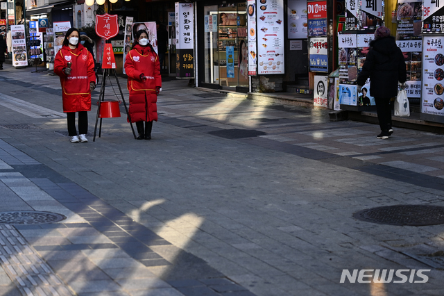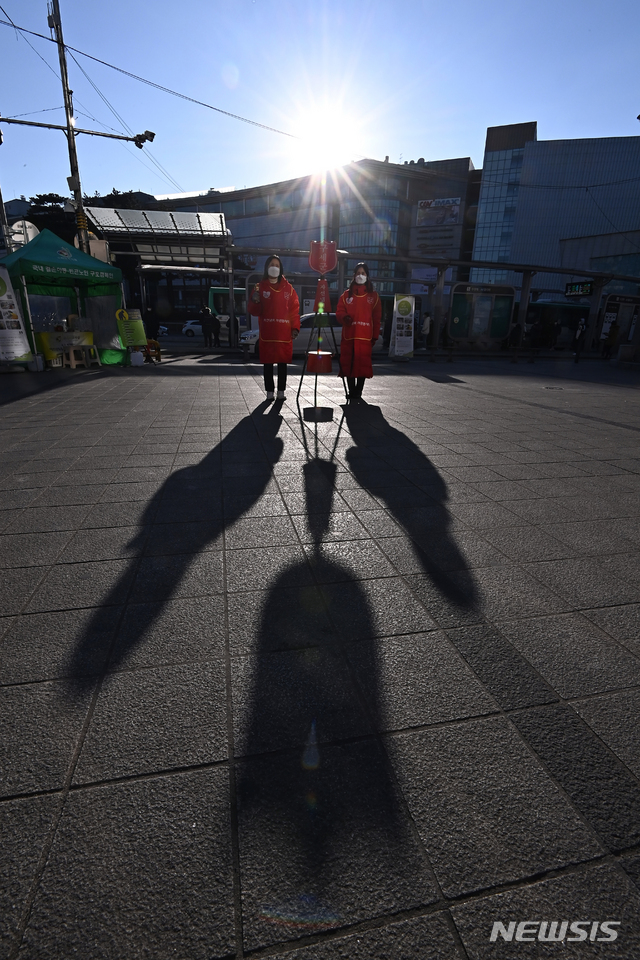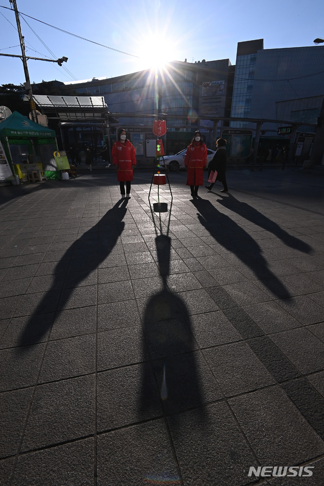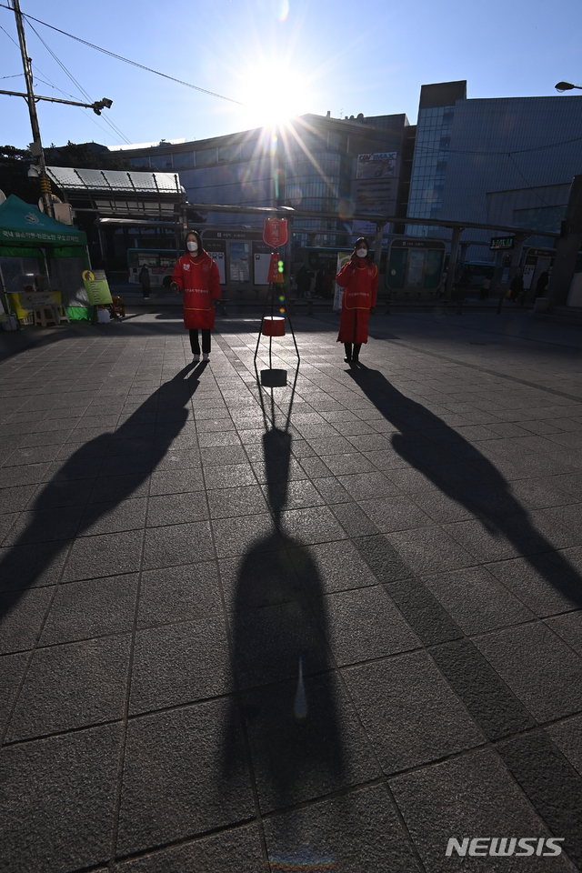【NEWSIS】寒波と新型コロナウイルス感染症の影響で、歳末助け合いの機会も減っているようだ。写真は15日午後、京畿道水原市八達区の「水原駅前ロデオ通り」で、募金を呼びかけるキリスト教系慈善団体「救世軍」の関係者。