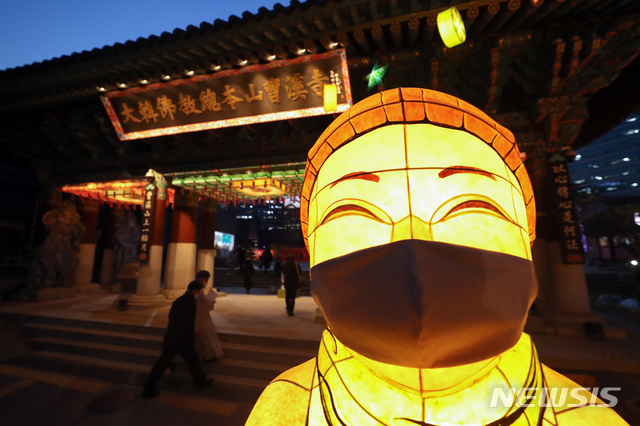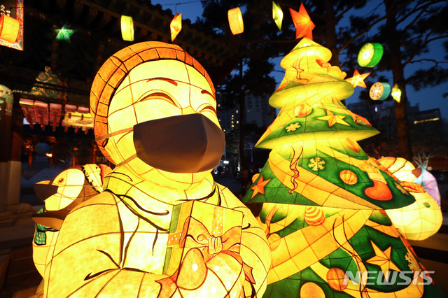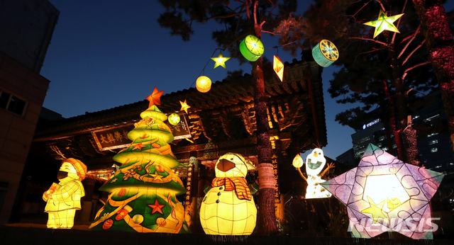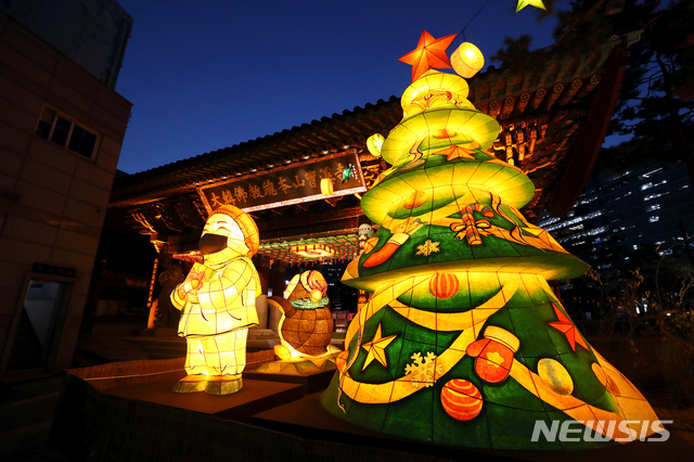 曹溪寺(ソウル市鍾路区)の一柱門で17日、クリスマス祝賀の燃灯がともされている様子。