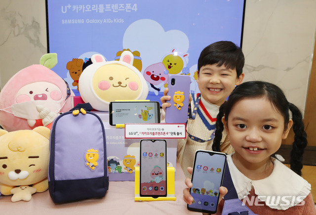 LGユープラスの児童保護機能強化型小学生専用スマートフォン「U+カカオ・リトルフレンズフォン4」の発売が迫った7日午前、ソウル市竜山区のLGユープラス本社で製品のPRイベントが開かれた。15日に発売されるU+カカオ・リトルフレンズフォン4は、児童の位置追跡、スマホ遠隔管理機能などを搭載している。