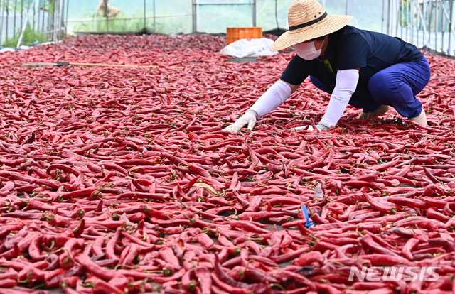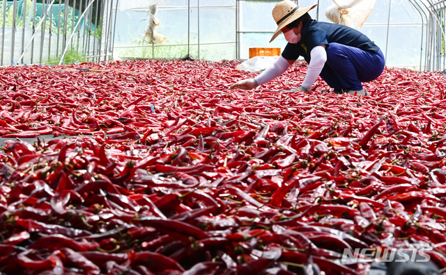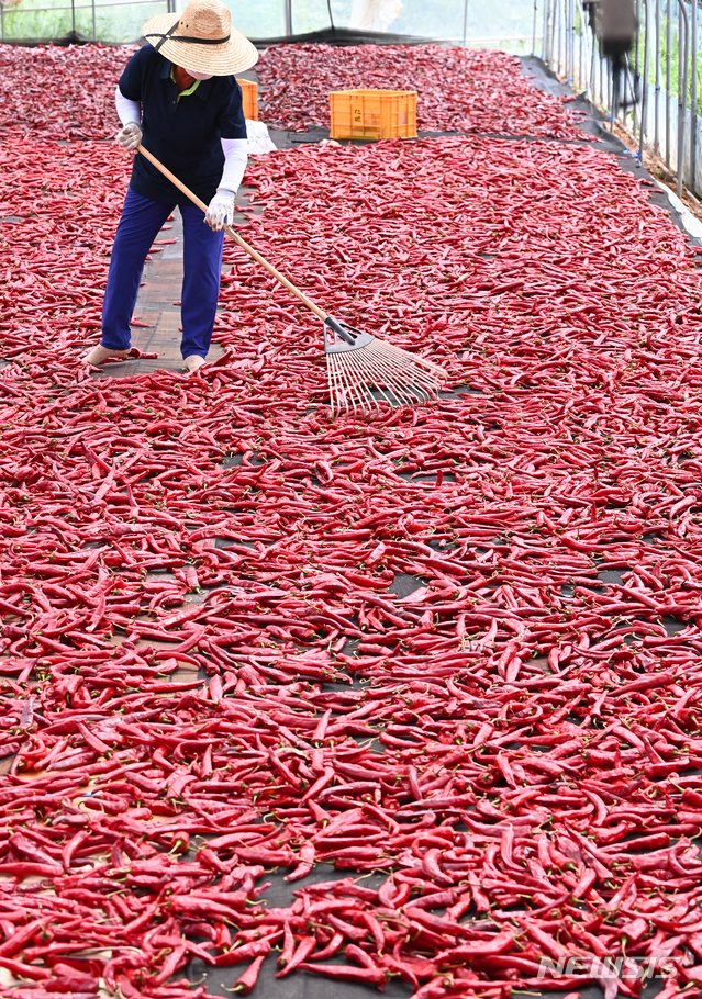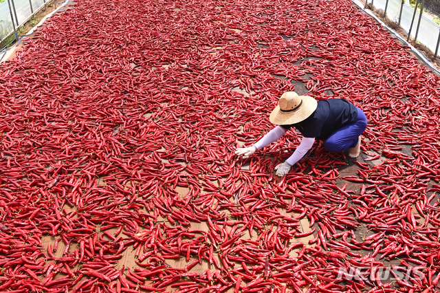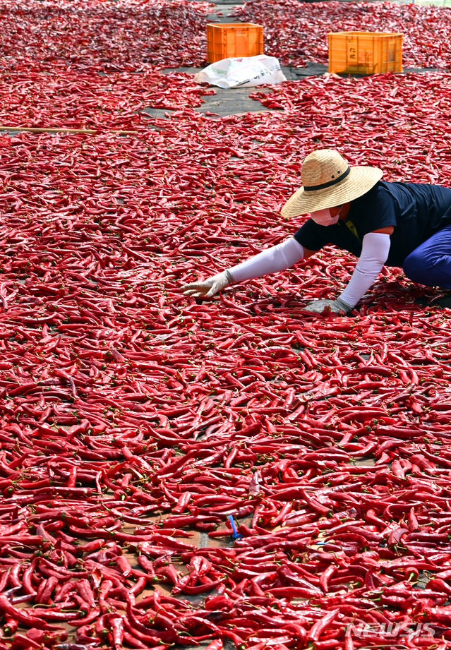 朝夕ほどよく涼しい天気となる中、京畿道竜仁市処仁区のある農家では、収穫したトウガラシの天日干しが行われていた。