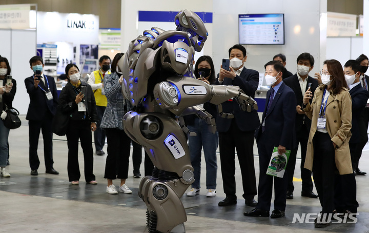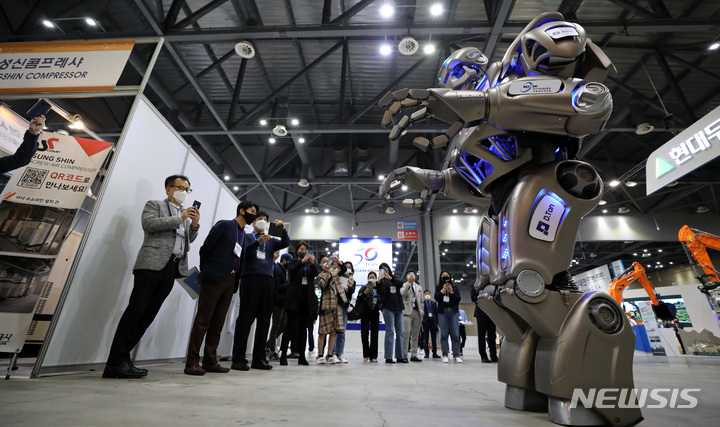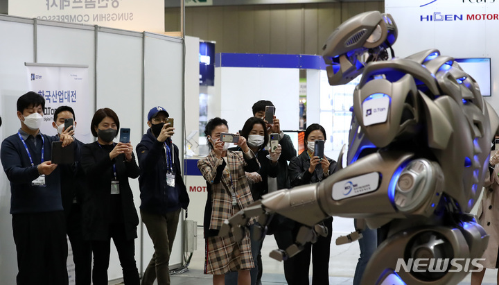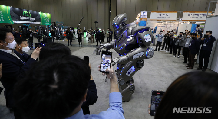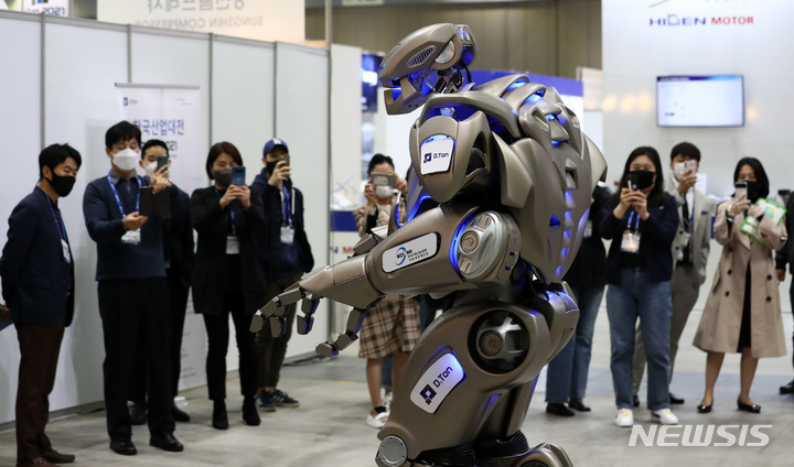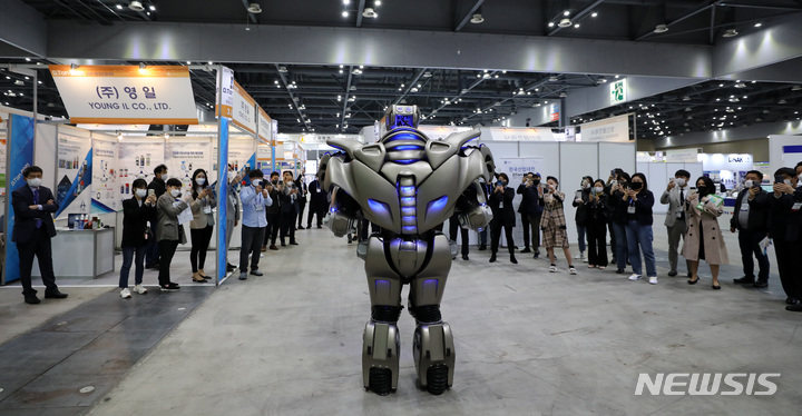 19日午前、京畿道高陽市のKINTEX第1展示場で開かれた「2021韓国産業大展」では、エンターテイナーロボット「タイタン・ザ・ロボット」が出現するや観客らが関心を示していた。