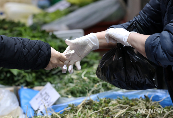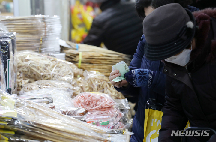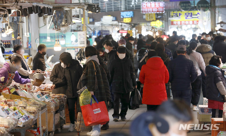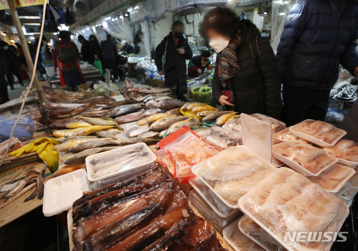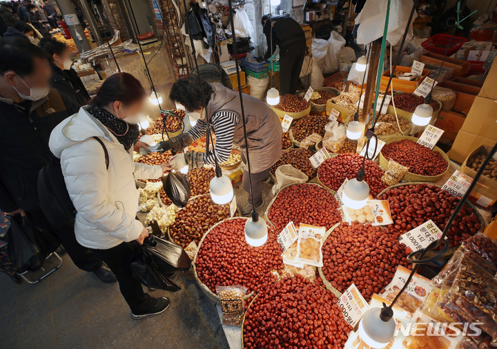 小商工人(小規模事業者)市場振興公団によると、今年の旧正月の祭祀(さいし)費用(4人家族基準)は平均で、全伝統市場(26万2,645ウォン=約2万5,000円)の方が大型スーパー(34万1,859ウォン=約3万2,600円)に比べて7万9,214ウォン(約7,600円)安いとのことだ。写真は旧正月まであと1週間となった23日午後、ソウル市東大門区の京東市場。旧正月用の食材を買い求める人々でにぎわっていた。