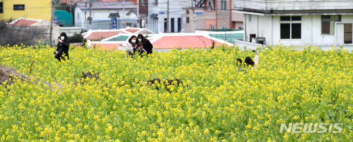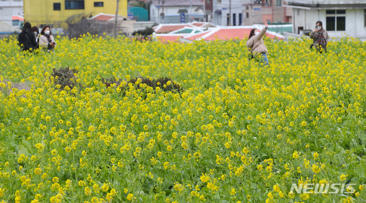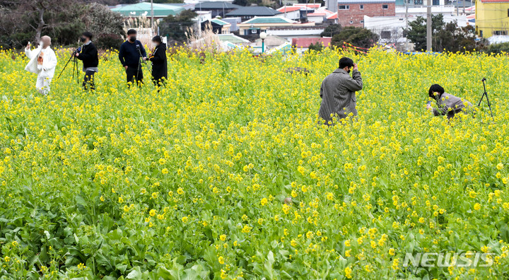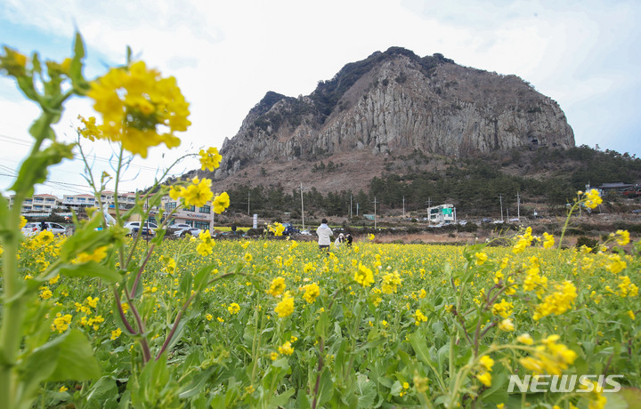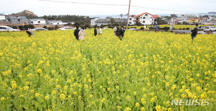 【NEWSIS】立春前日の3日午後、済州特別自治道西帰浦市内の山房山近くでは、春を告げる菜の花が満開になっていた。
