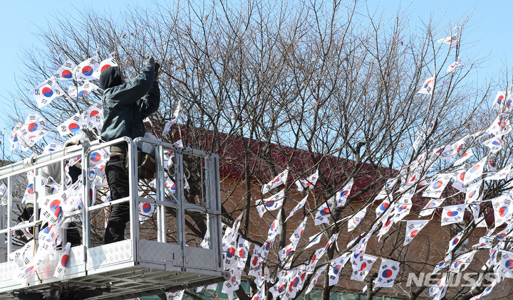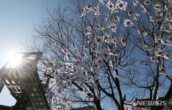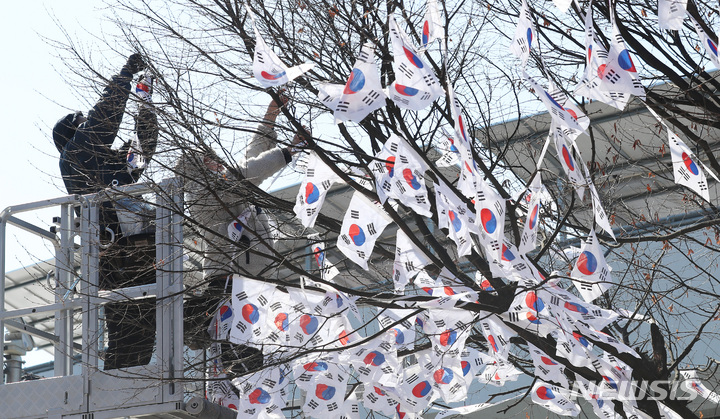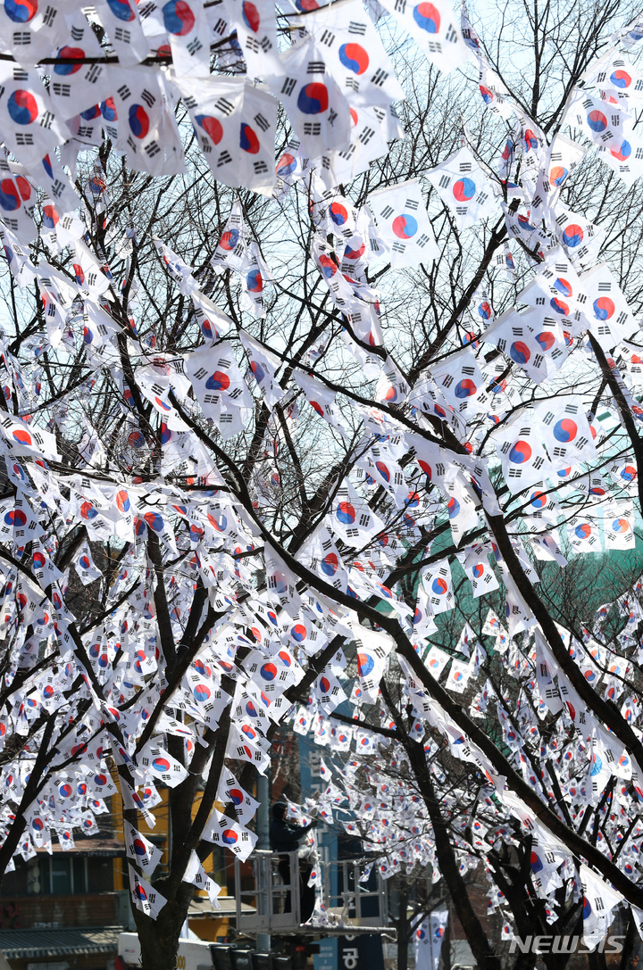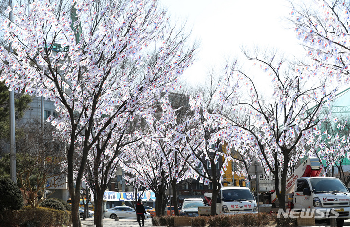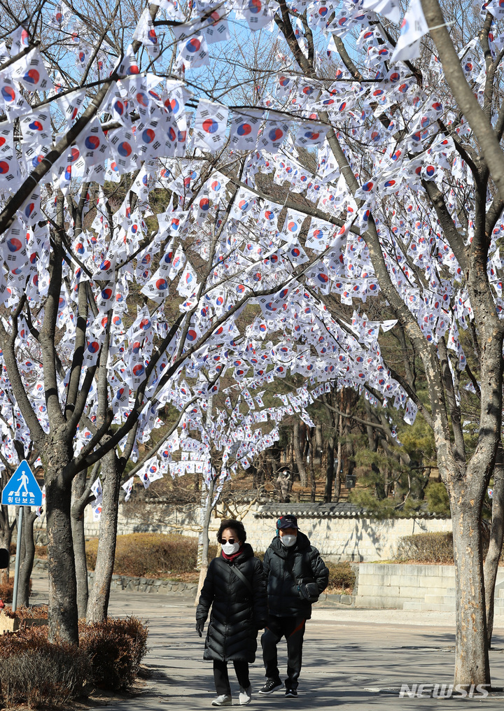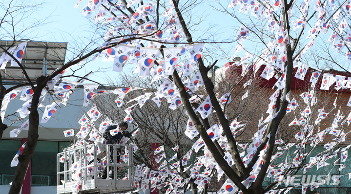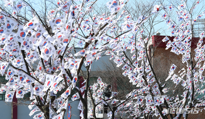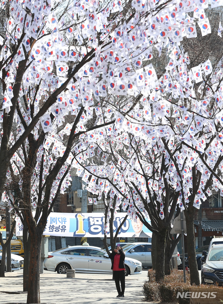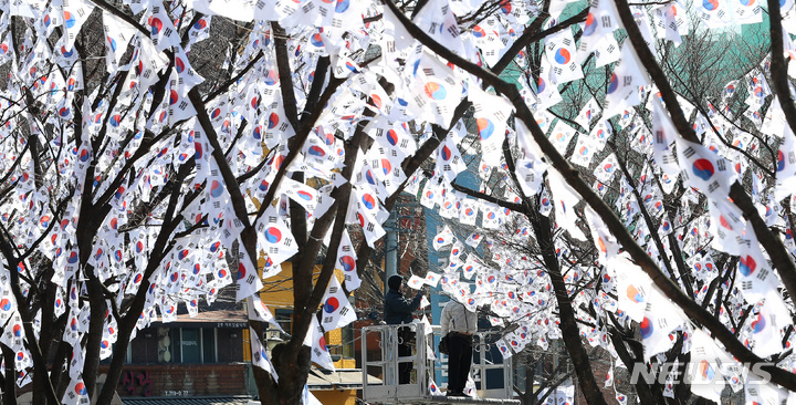 3・1節103周年まであと六日と迫った23日午後、ソウル市竜山区の孝昌公園一帯に造成された「太極旗通り」の様子。竜山区は、地下鉄6号線孝昌公園前駅から孝昌公園付近まで710メートルの区間に太極旗通りを造成して3・1節を記念し、愛国先烈の独立運動精神をたたえると発表した。太極旗通りは来月6日まで見て回ることができる。