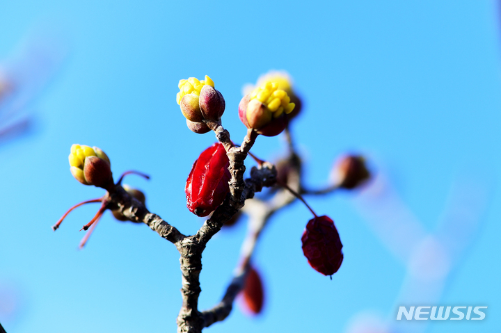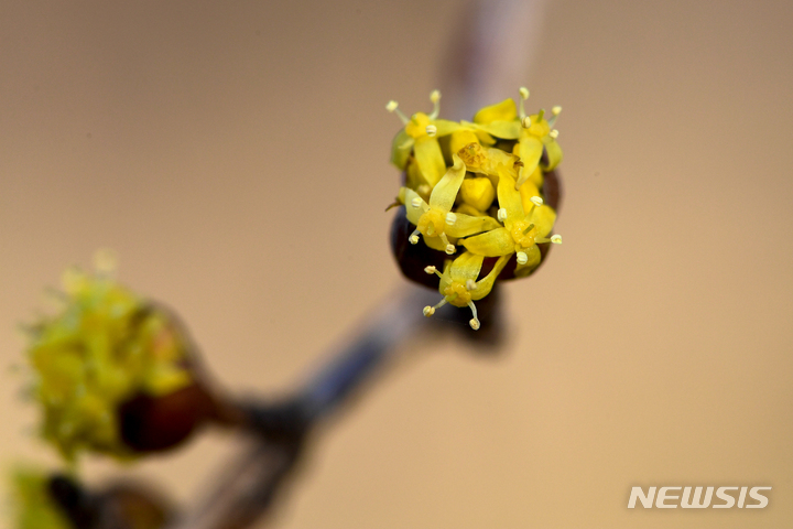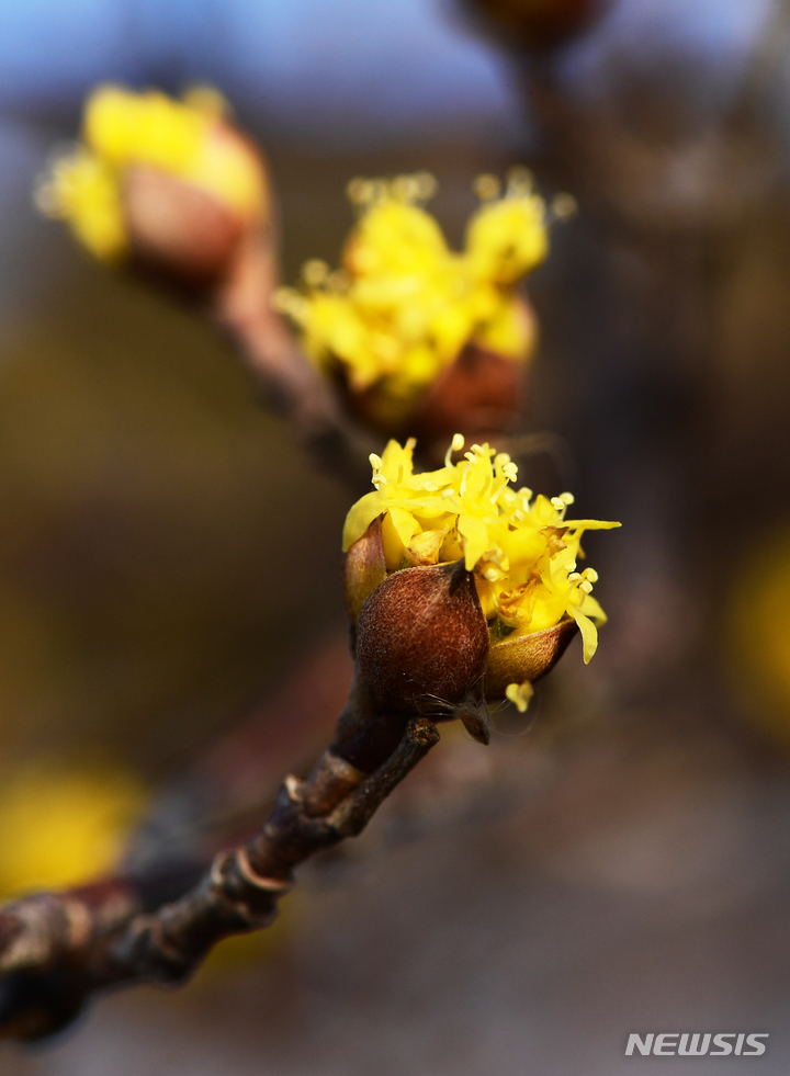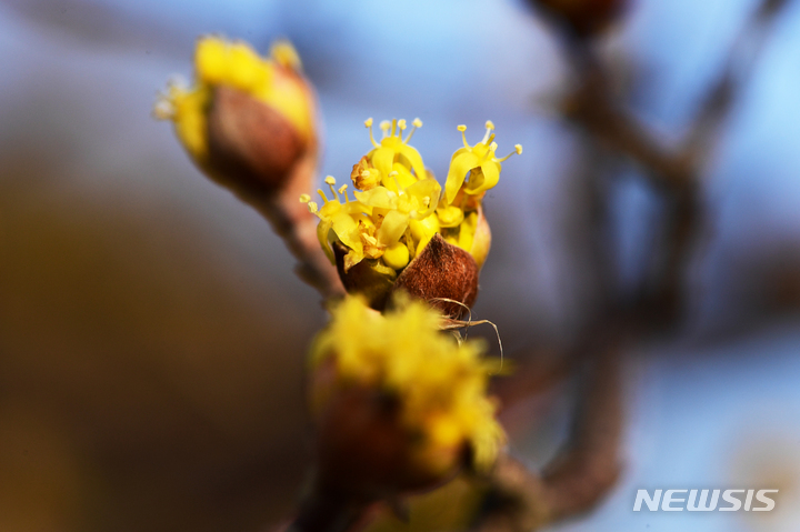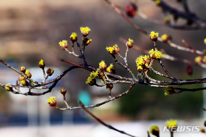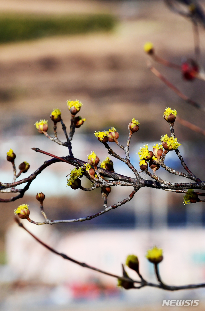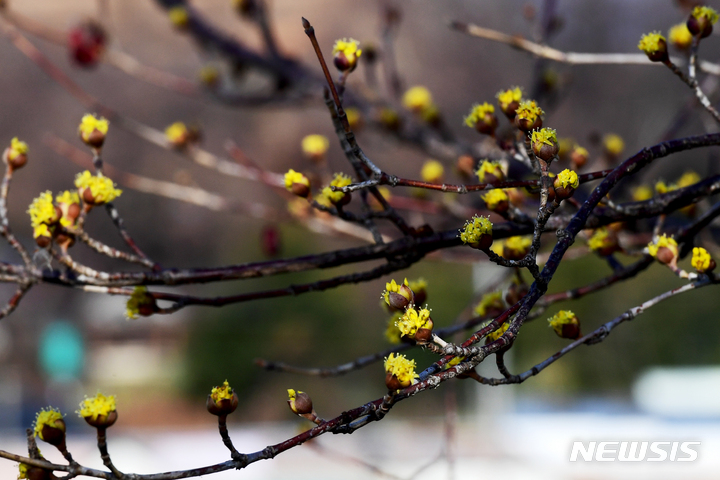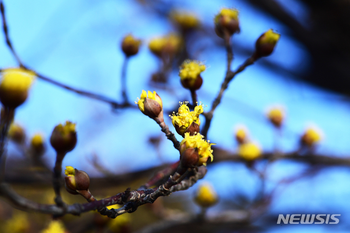 すっきり晴れて乾燥した一日となった2日午前、慶尚南道南海郡古県面ではサンシュユの黄色い花が咲き、春の訪れを告げていた。