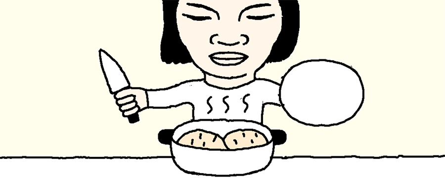 ジャガイモをぐるりと1周するように包丁で切れ目を入れてからゆでた後、冷水で冷やし、切れ目部分からむくと、きれいにむける。