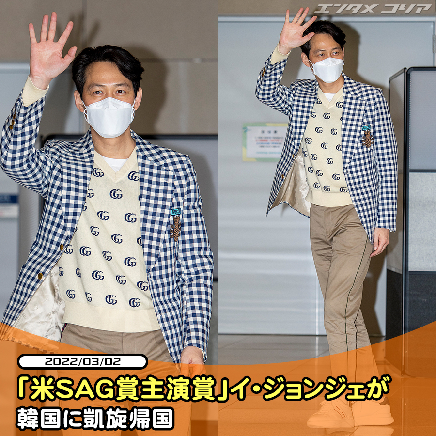 第28回全米映画俳優組合賞(Screen Actors Guild Awards=SAG)にて、NETFLIX『イカゲーム』でテレビ部門主演男優賞に輝いた俳優イ・ジョンジェが2日午後、仁川国際空港経由で韓国に戻ってきた。