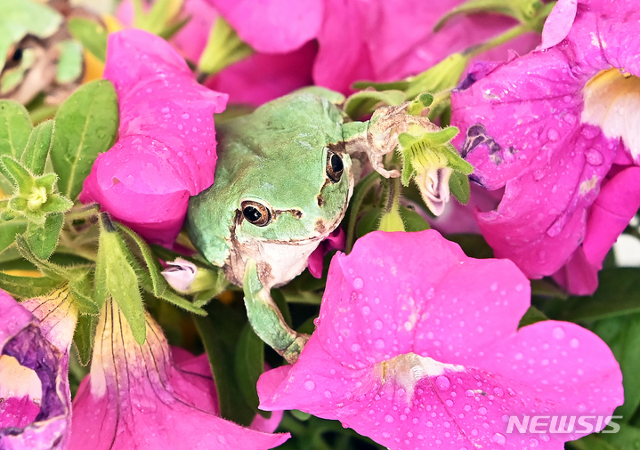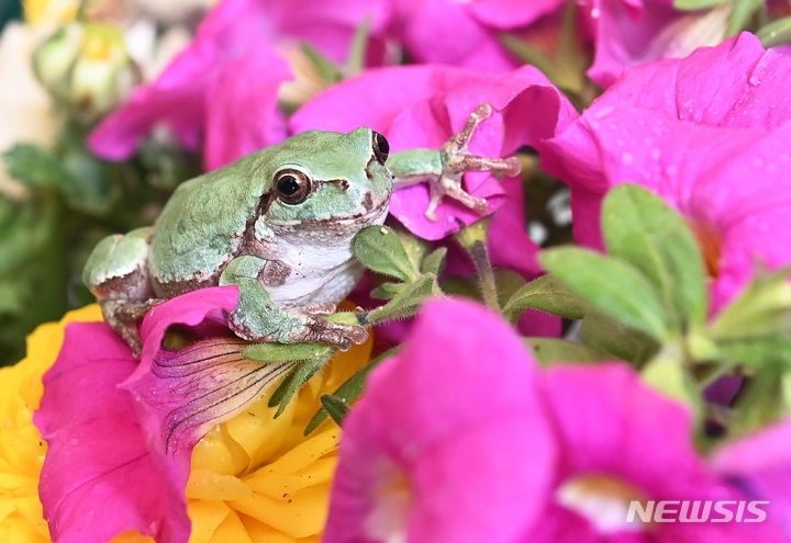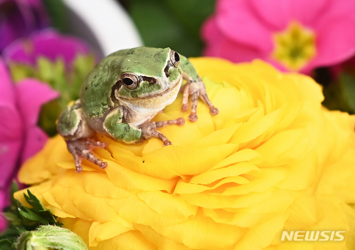 二十四節気の一つ「啓蟄」まであと二日となった3日午後、京畿道華城市機山洞の京畿道農業技術院昆虫支援センターで、さわやかに咲いた春の花の上に座る研究用のアオガエル。