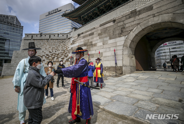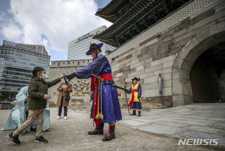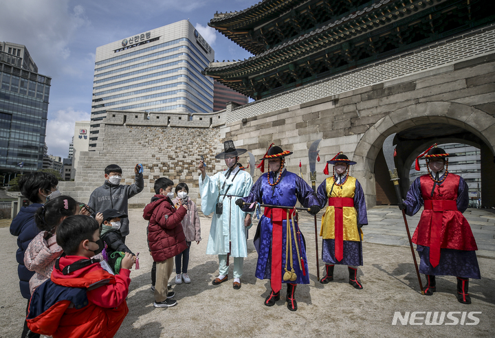 【NEWSIS】20日午後、ソウル市中区の崇礼門(通称:南大門)を訪れ、「号牌」作りを体験した子どもたち。号牌とは氏名・年齢などが書かれた朝鮮時代の身分証のようなものだ。16歳以上の男子が身に着けていて、これを見せると門を通ることができた。