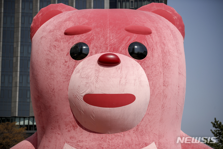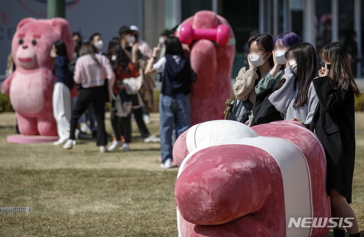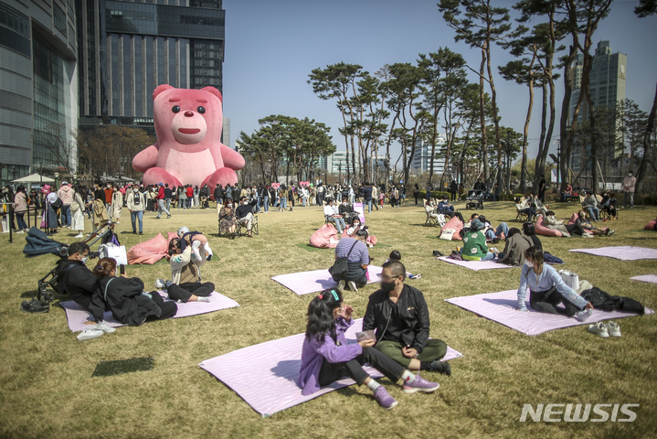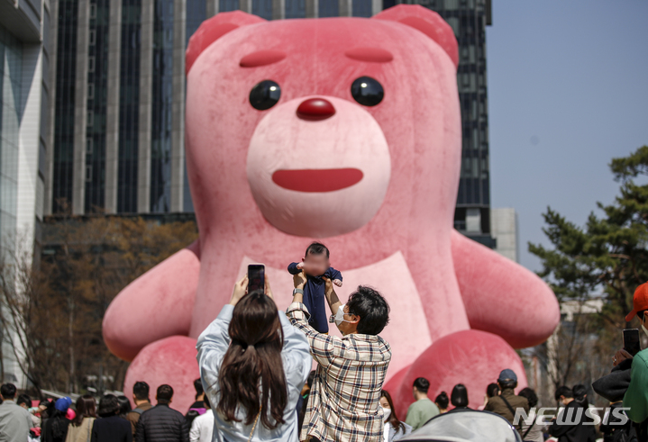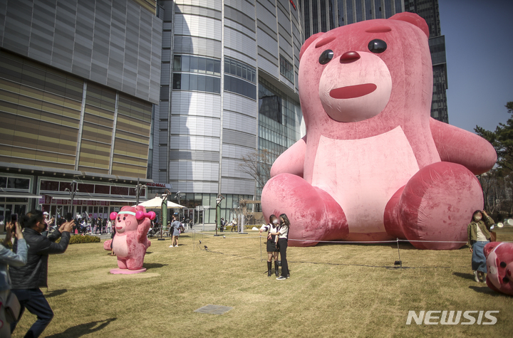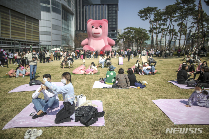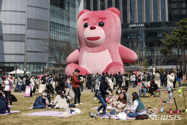 うららかな春の天気となった4日午後、ソウル市松坡区に位置するロッテワールドタワーの芝生広場では、訪れた市民が「ベリークマ」と共に記念写真を撮っていた。