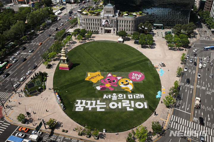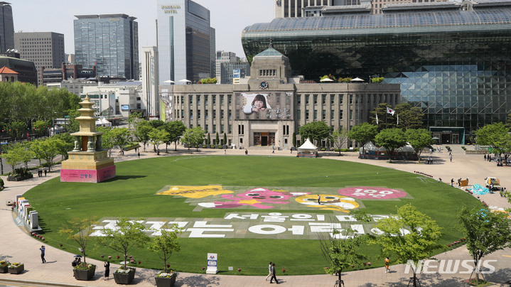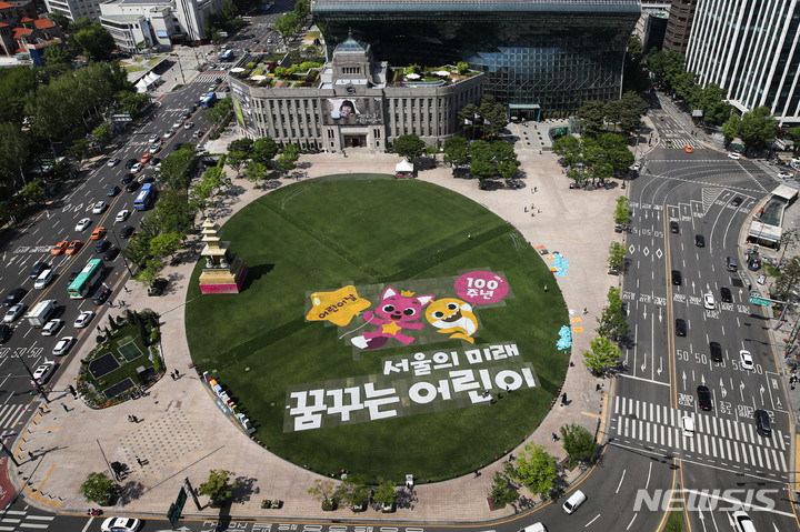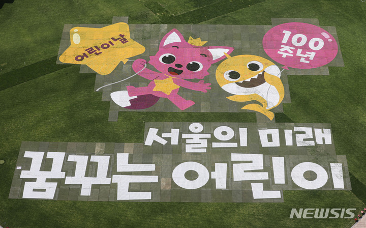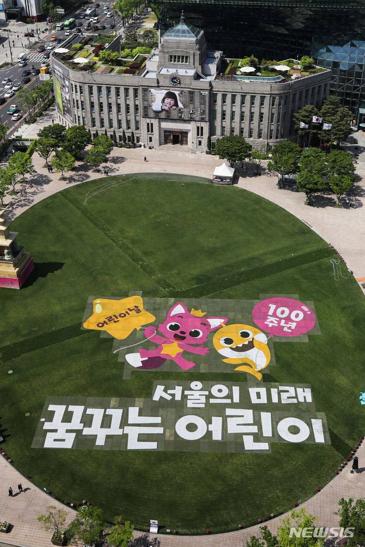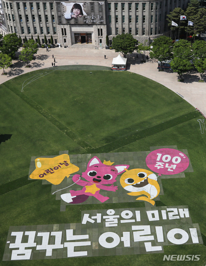 「子どもの日」100周年まであと二日と迫った3日午後、ソウル市中区のソウル市庁前芝生広場に、子どもの日100周年記念メッセージが表示されている様子。ソウル市は子どもの日100周年に合わせ、5月は人気キャラクター「ピンクポン」「ベイビーシャーク」と共に「ソウルの未来、夢見る子ども」キャンペーンを展開することを明らかにしている。