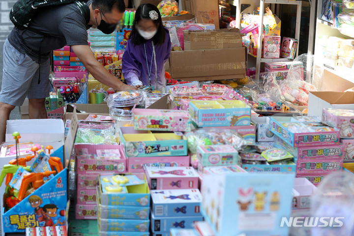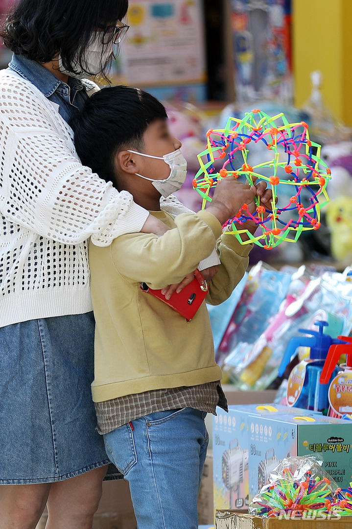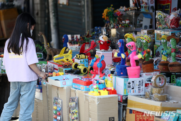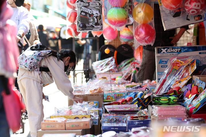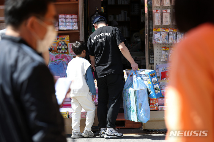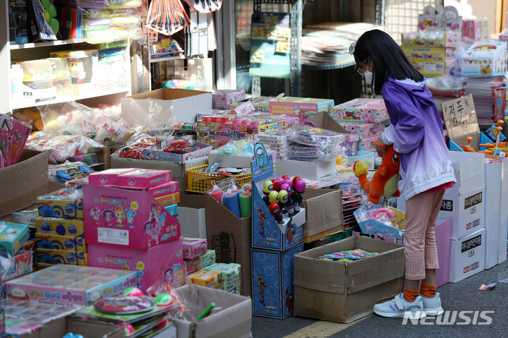【NEWSIS】「こどもの日」の5日午前、ソウル市鍾路区昌信洞の文具・おもちゃ市場では、こどもが店頭に並ぶおもちゃを見ていた。
