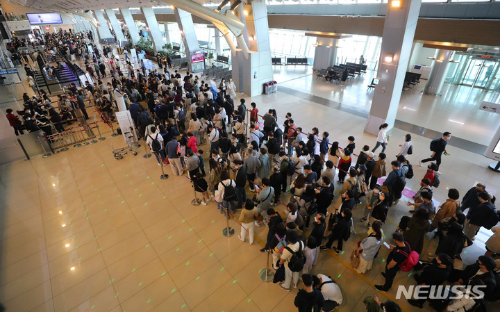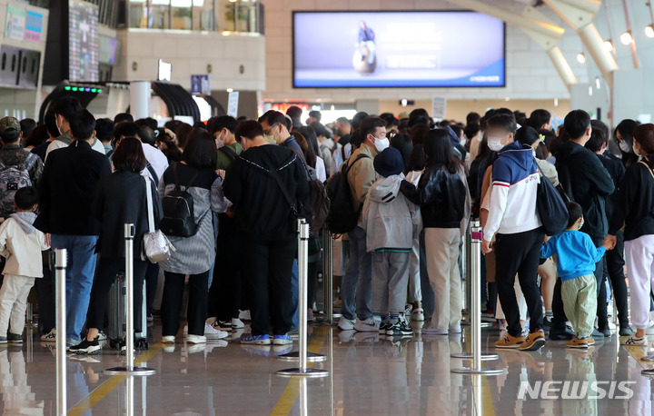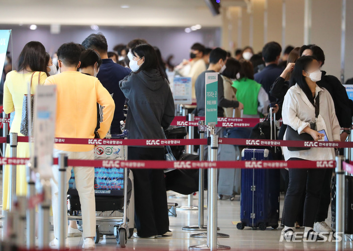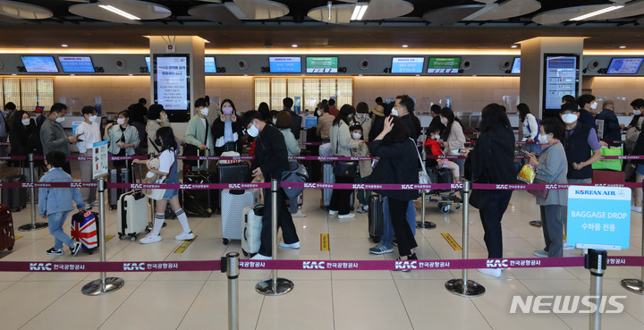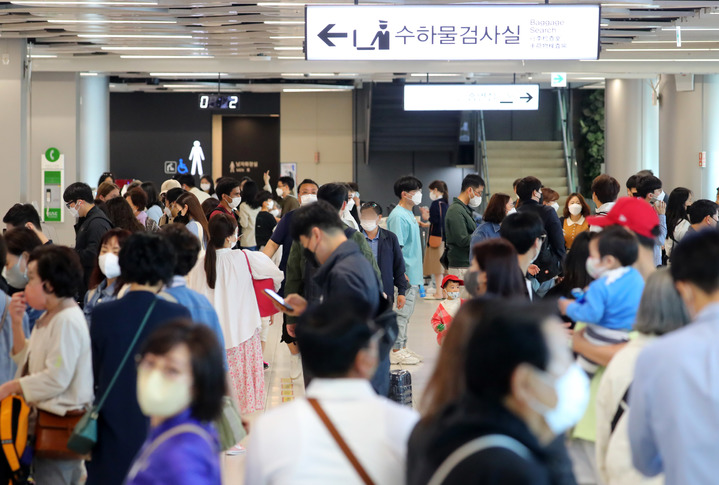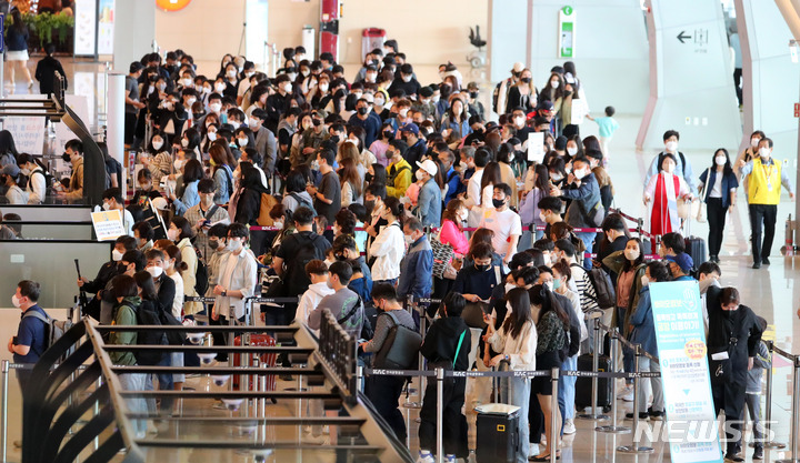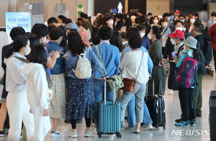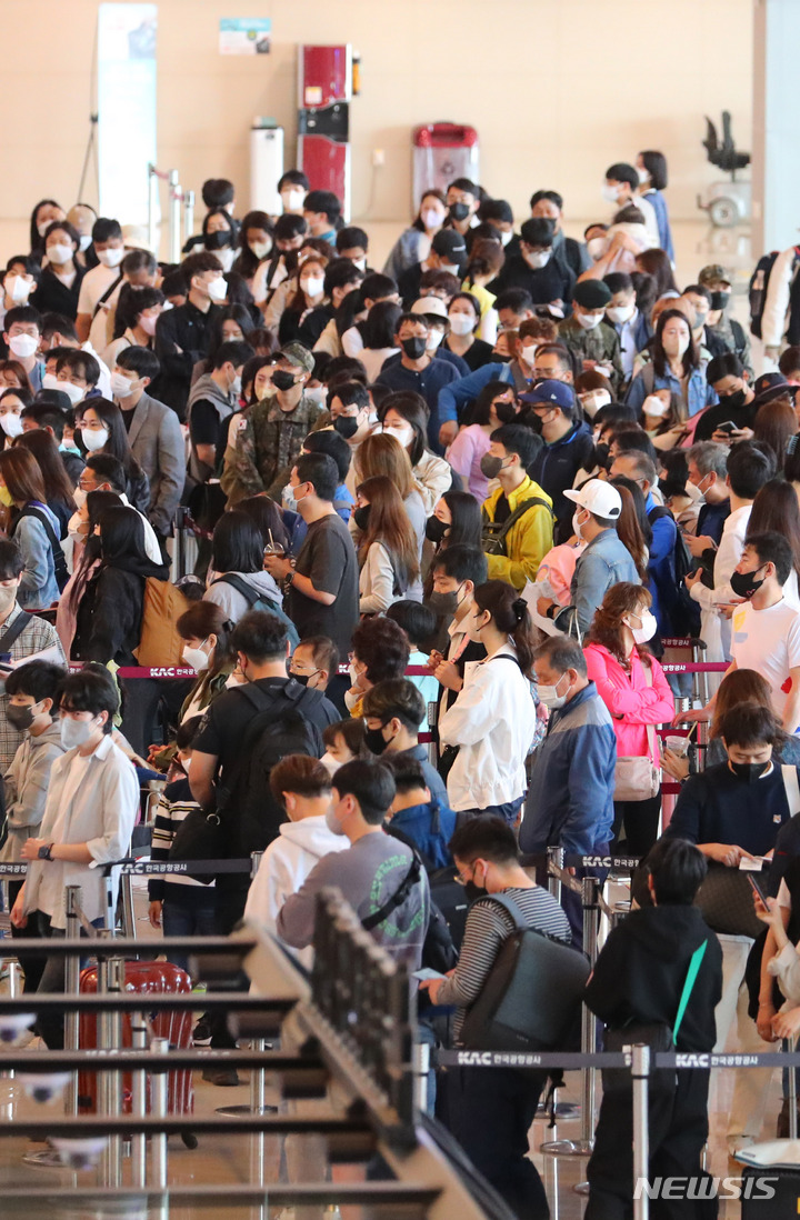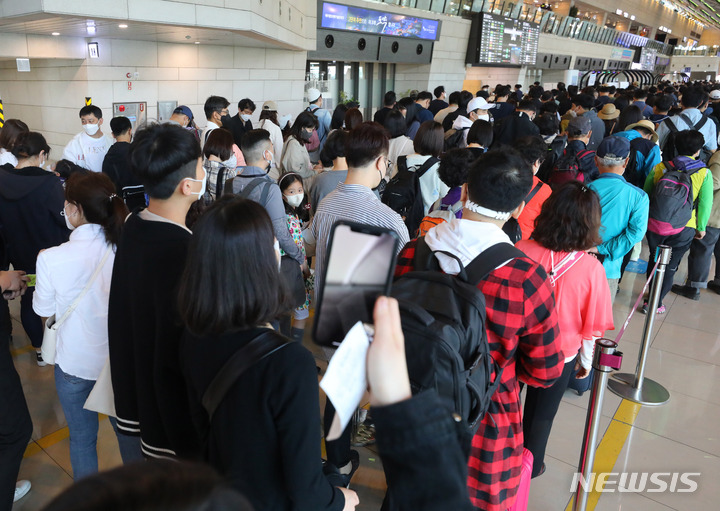【NEWSIS】「こどもの日」連休が始まった5日午前、ソウル市江西区の金浦国際空港出国ゲートは、旅行に出発する人々で込み合っていた。