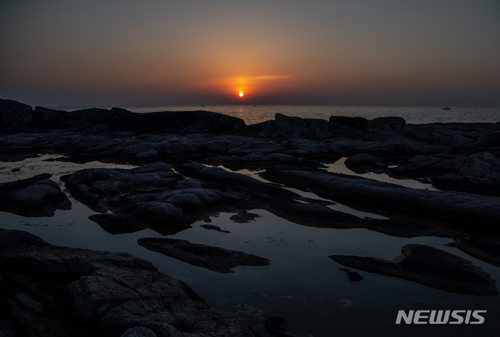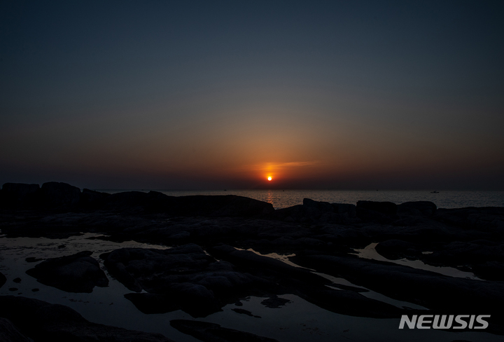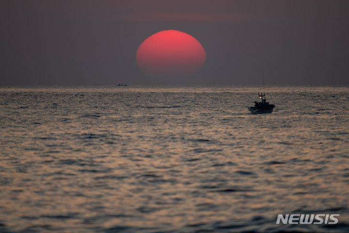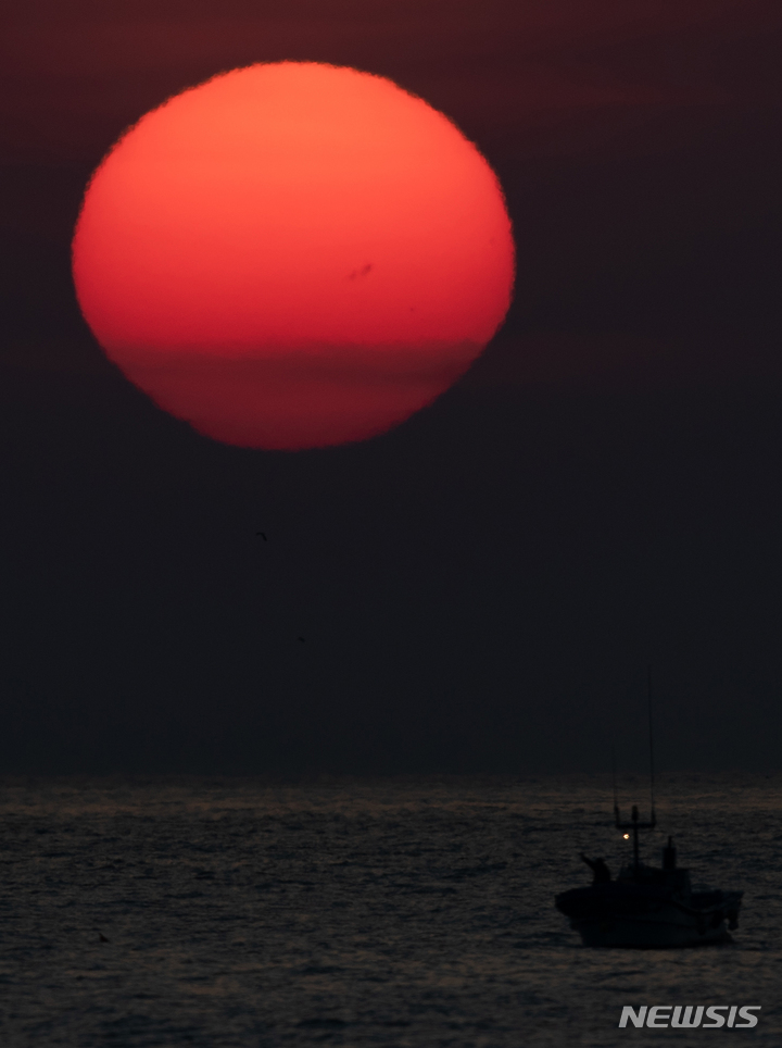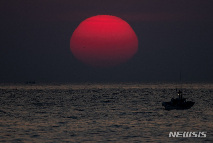 【NEWSIS】5日午前、江原道束草市の霊琴亭から見た海。水平線から真っ赤な朝日が昇っていた。