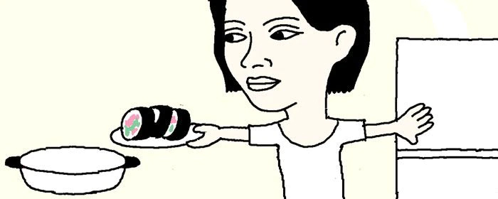 残ってしまって冷蔵庫に入れておいたキムパプ(韓国のり巻き)は、溶き卵を付け、油を敷いて弱火で熱したフライパンで両面を焼くと、温かくてしっとりとした食感が楽しめるようになる。