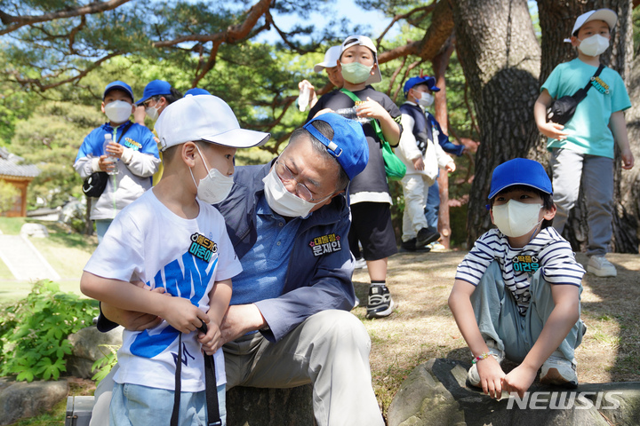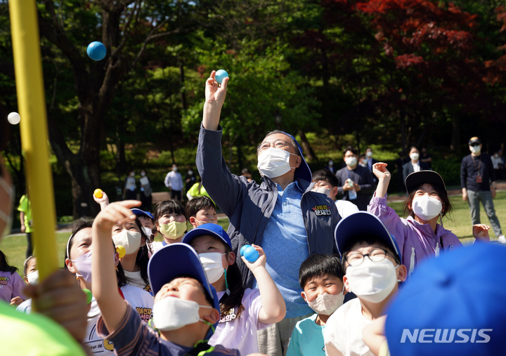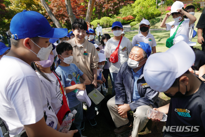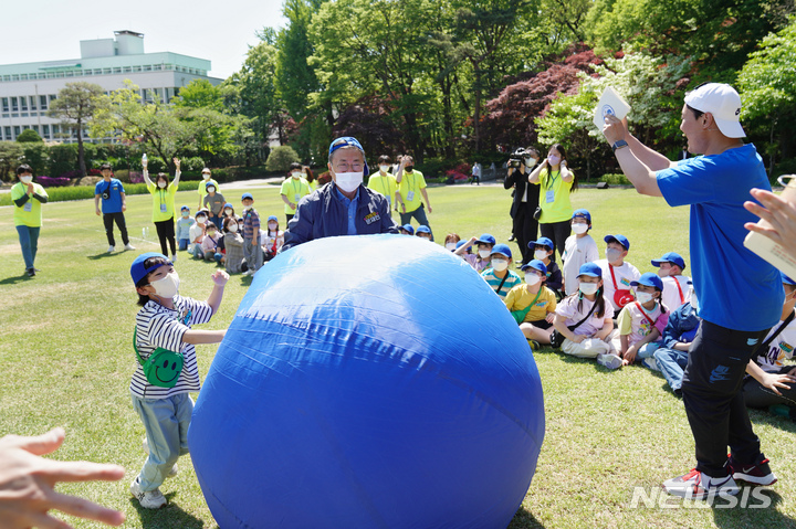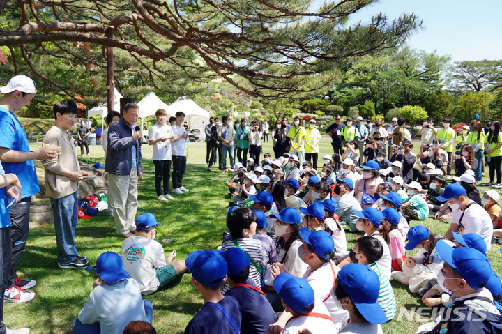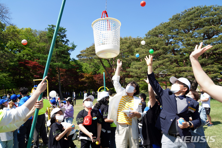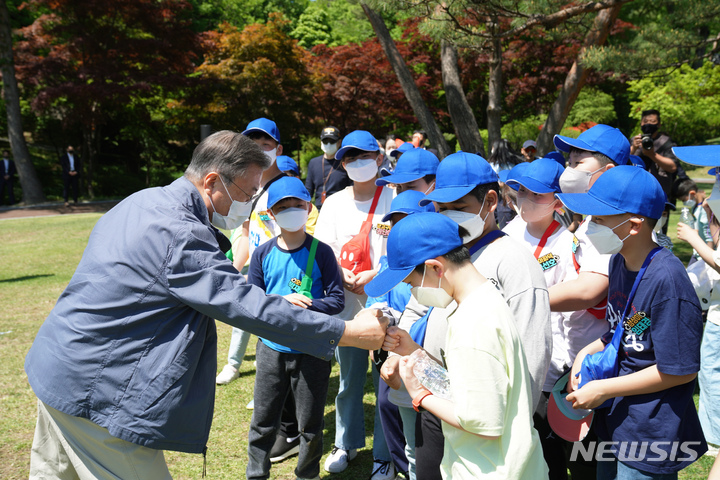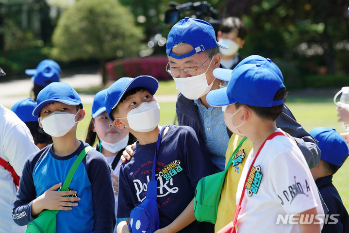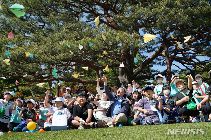 5日、青瓦台(韓国大統領府)の緑地園で開かれた「2022年 子どもの日100周年記念 青瓦台子ども招請行事」にて、子どもたちと一緒に紙飛行機を飛ばしながら記念撮影をする韓国の文在寅(ムン・ジェイン)大統領。