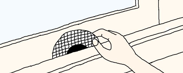 蚊のような虫は、小さな穴や隙間からも入ってくる。窓枠下段の水抜き穴も防虫ネットなどで覆えば、害虫の侵入を防ぐことができる。