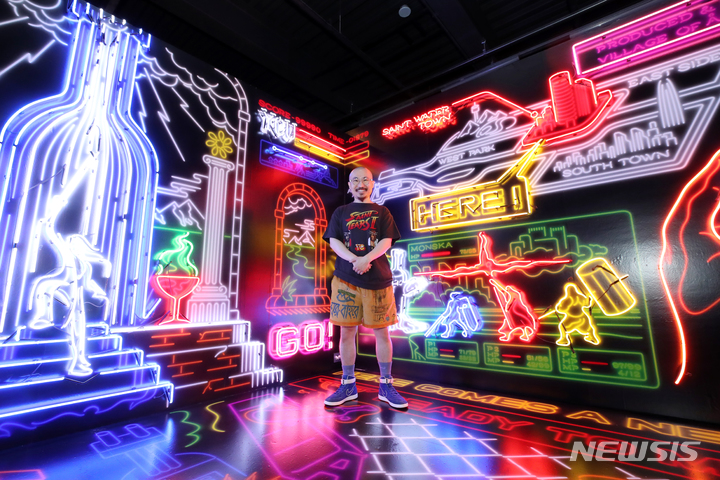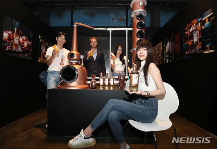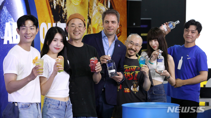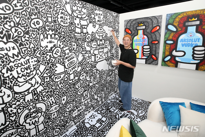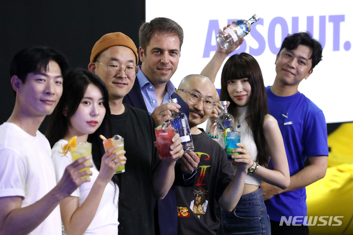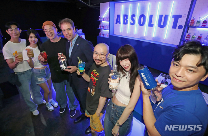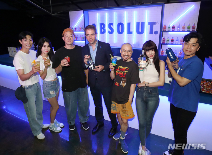 ソウル市城東区のS Factoryにオープンした「ABSOLUT HOME」ポップアップストアの空間で6日午前、コンパニオンと共にポーズを取って見せるPernod Ricard Koreaのミグエル・パスカル・マーケティングチーム長。