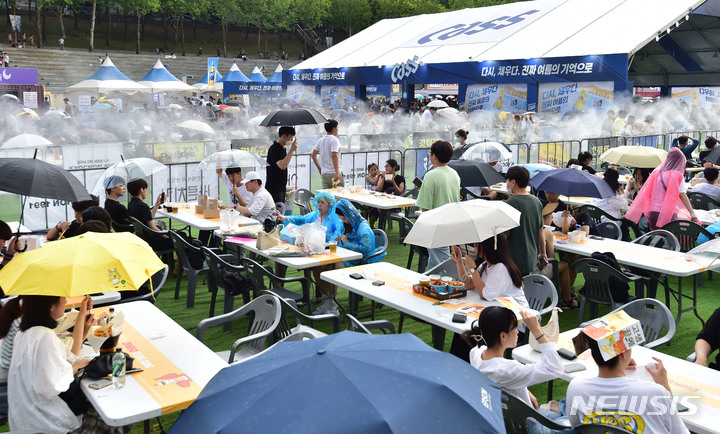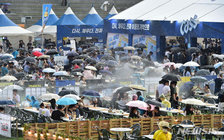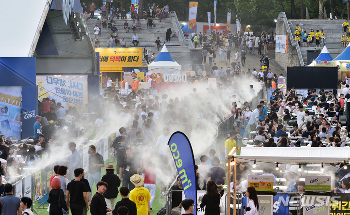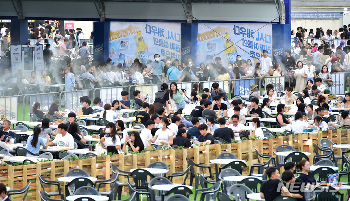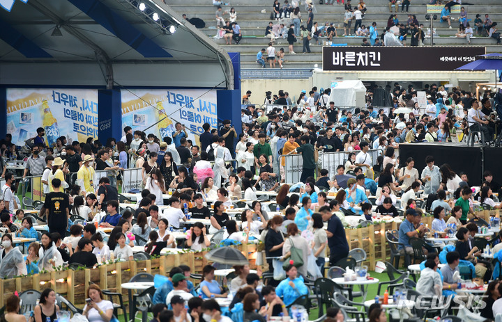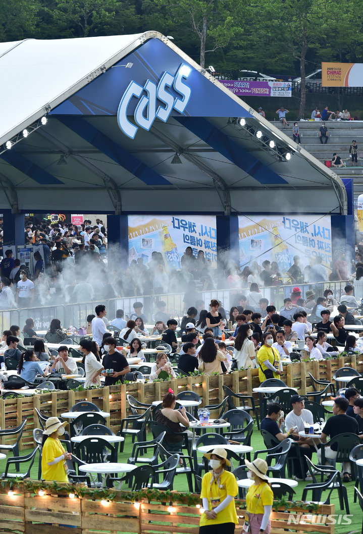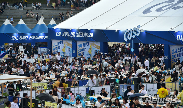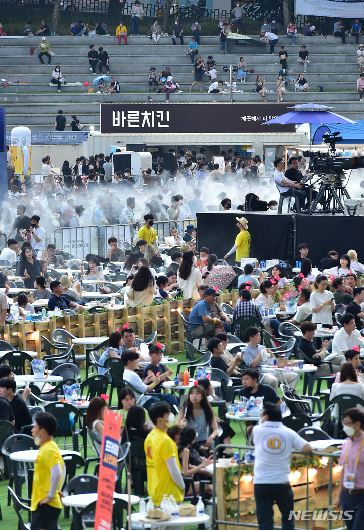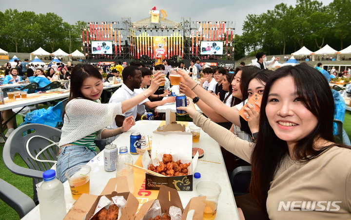 6日午後、大邱市達西区の頭流野球場で開催された2022年大邱チメク(フライドチキン&ビール)フェスティバルの会場を訪れた市民たちが、冷えたビールとアツアツのチキンを味わいながらイベントを楽しんだ。大邱チメクフェスティバルは新型コロナウイルス感染症の影響で中止されていたが、今回3年ぶりに開幕した。