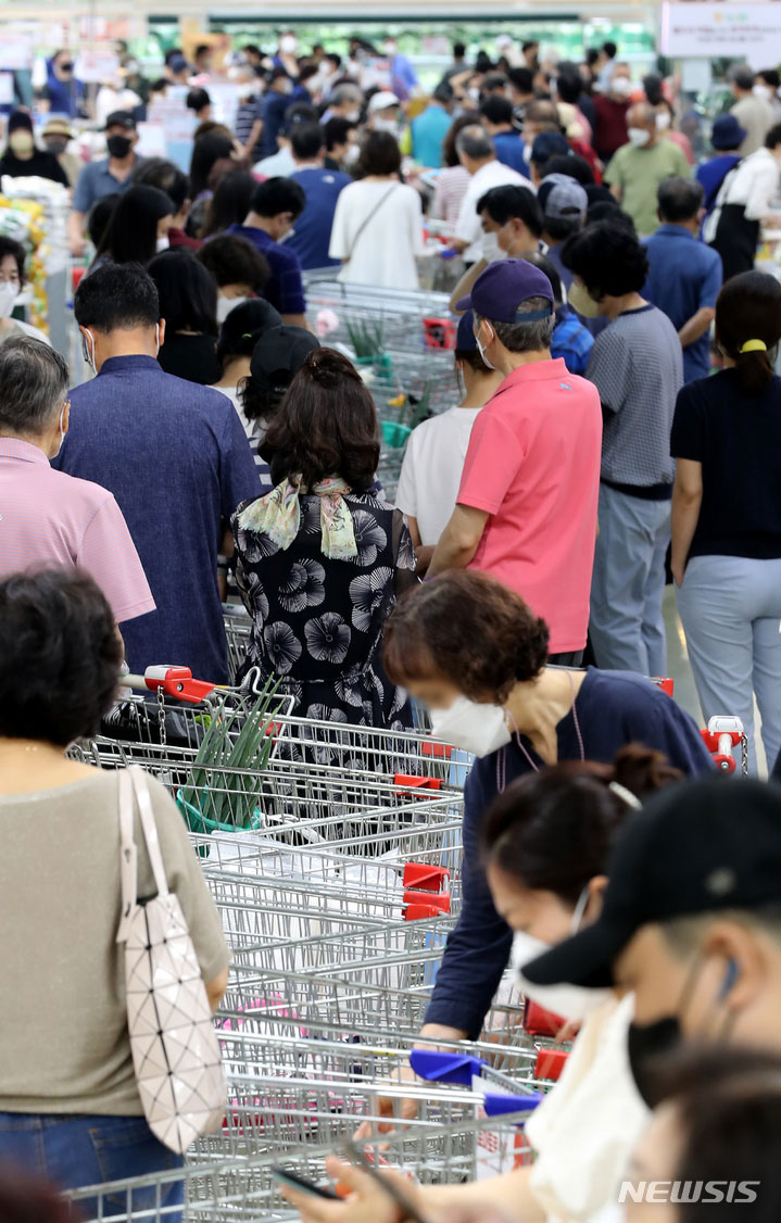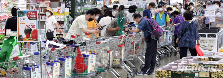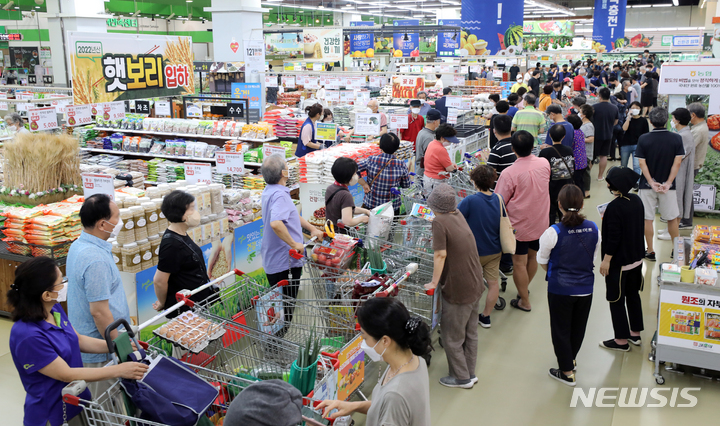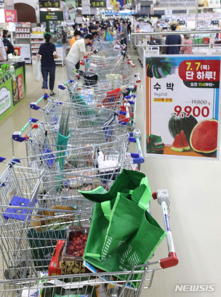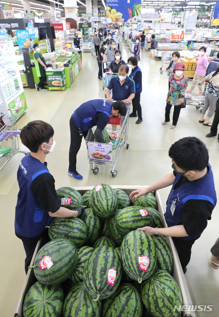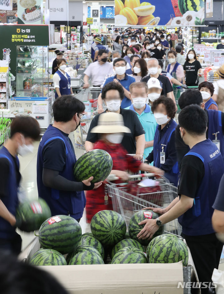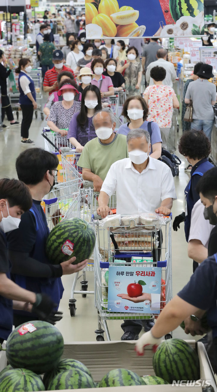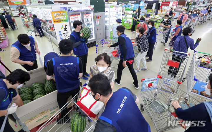 食品価格の高止まりが続いている7日、ソウル市瑞草区の農協流通ハナロマート良才店に用意されたスイカ半額割引イベントの会場に長い行列ができている様子。