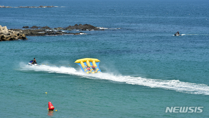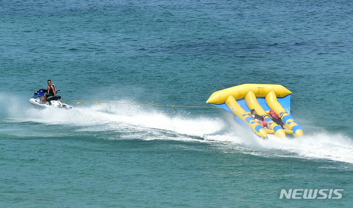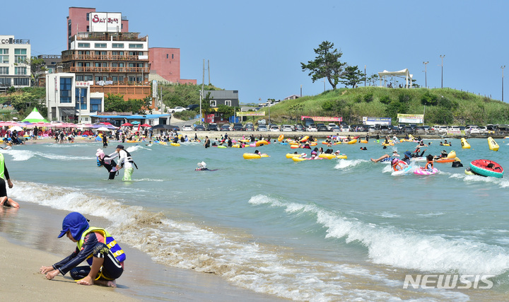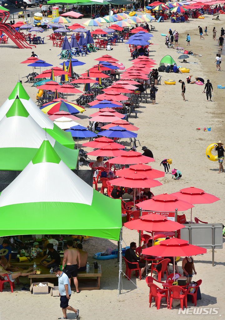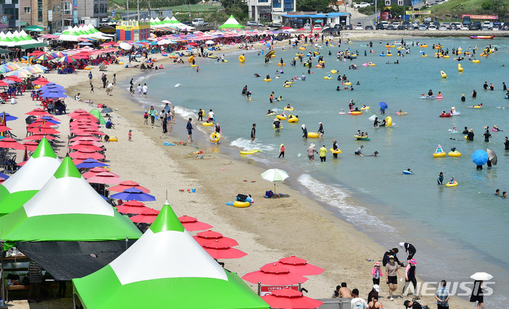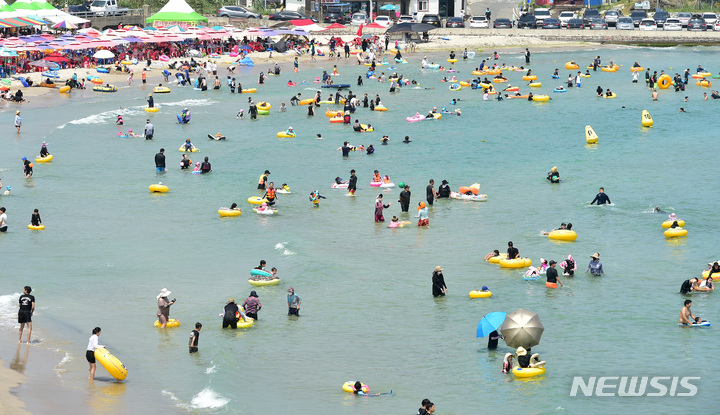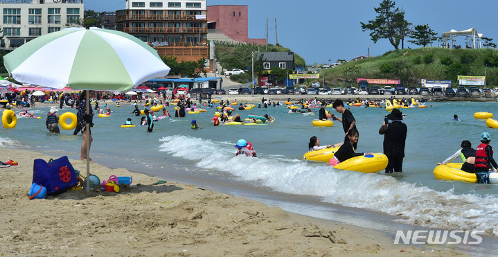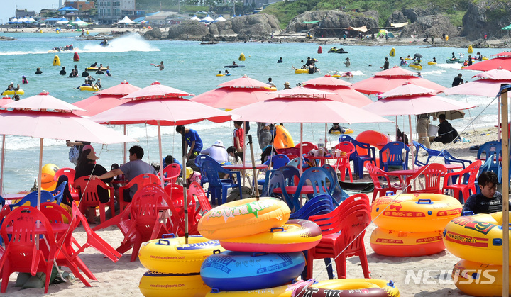 【NEWSIS】暦の上では「立秋」だが暑さが続いた7日午後、慶尚北道浦項市内の九竜浦海水浴場を訪れた海水浴客たち。海辺で楽しいひとときを過ごしていた。