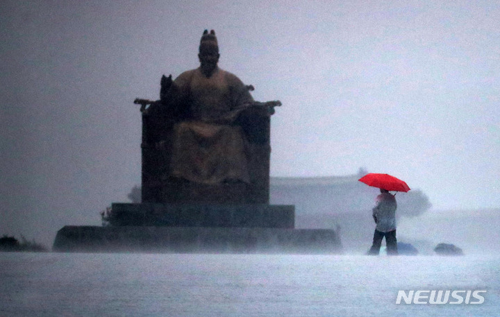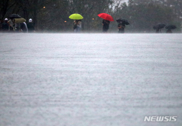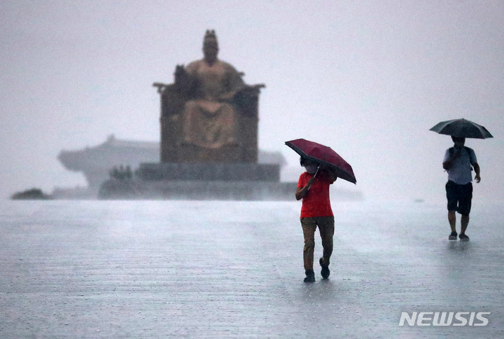 梅雨前線の影響で韓国中部地方をはじめ各地で雨が降った8日午後、ソウル市鍾路区光化門広場で、傘を差して道を急いでいる市民の様子。