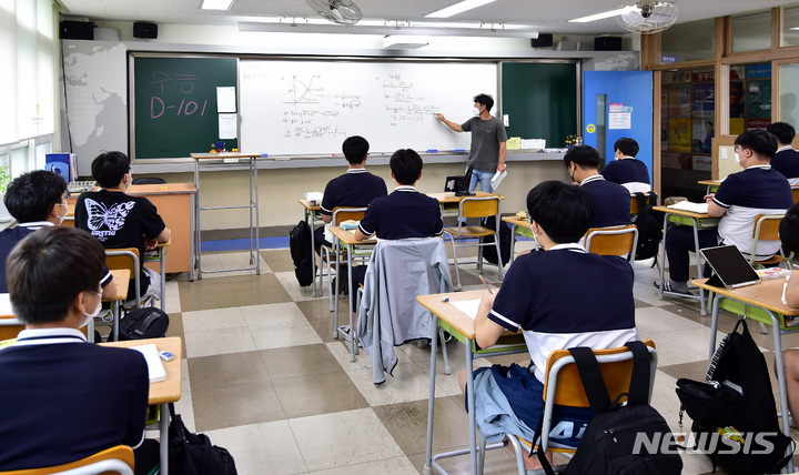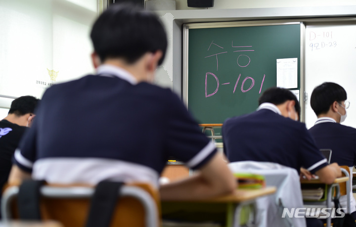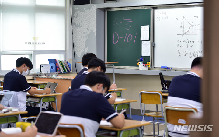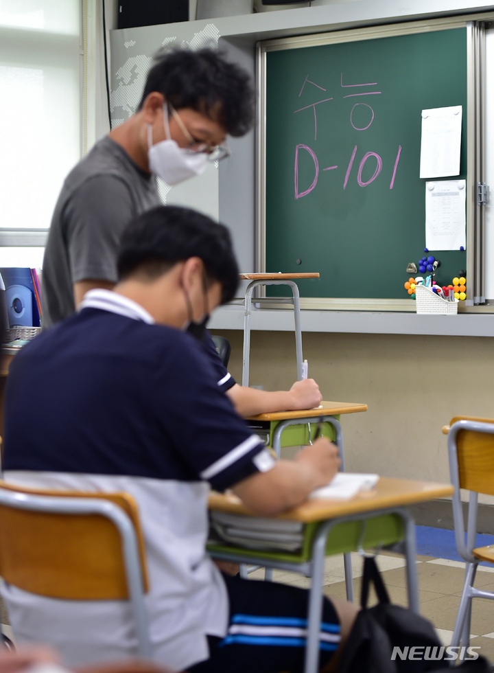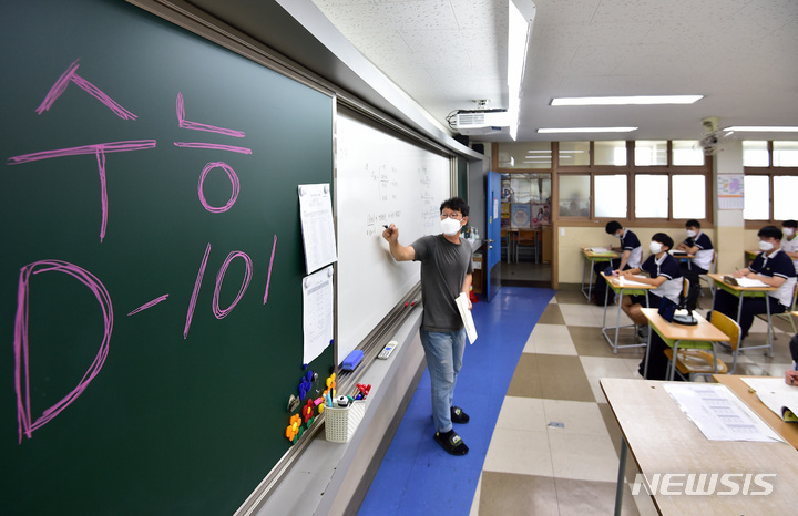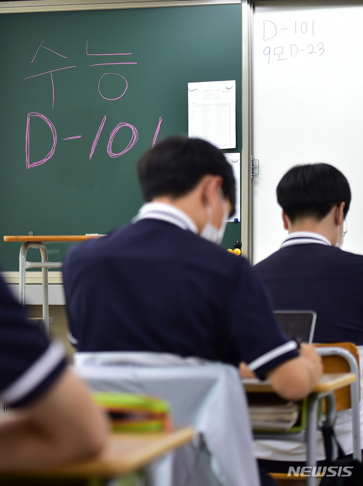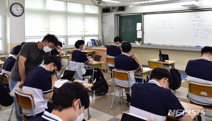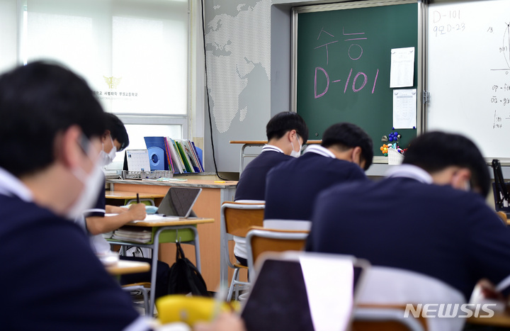 2023年度大学修学能力試験(修能。大学入学共通テストに相当)まであと101日となった8日、慶北大学師範学部付設高校(大邱市中区)の3年生の教室で、授業に集中している受験生の様子。