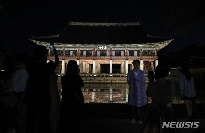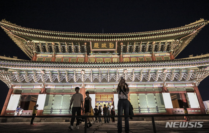 【NEWSIS】夜間特別観覧の初日だった1日午後、ソウル市鍾路区の景福宮を訪れた人々。今年下半期の景福宮夜間特別観覧は11月6日まで行われる。観覧時間は午後7時から午後9時30分まで。