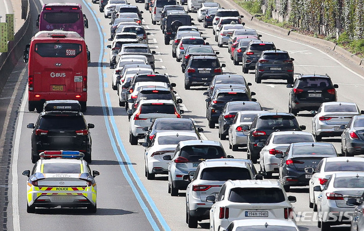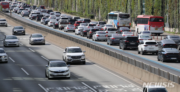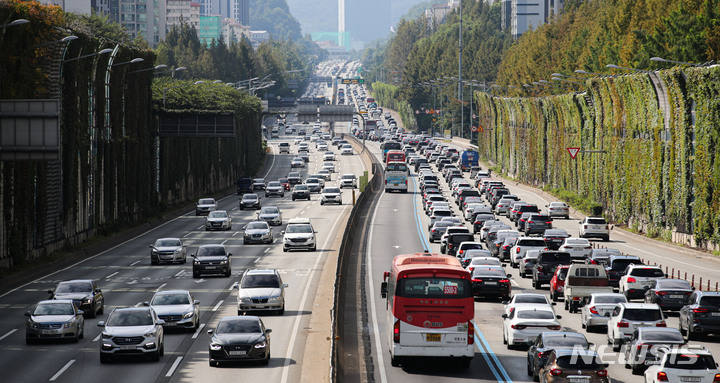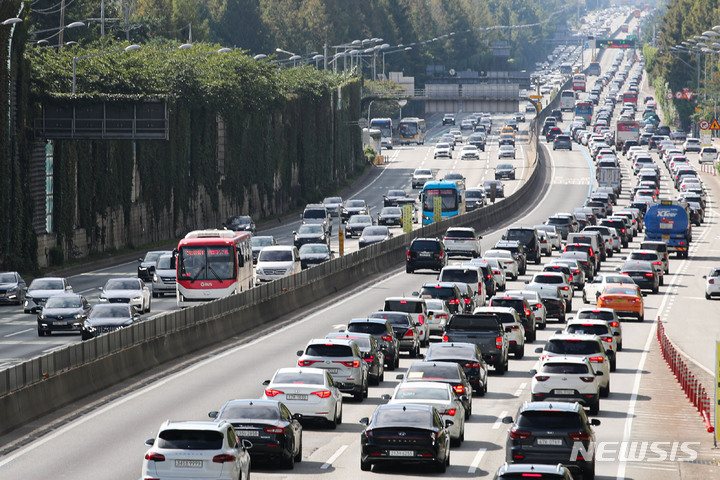 【NEWSIS】秋夕(チュソク=中秋節)の連休初日の9日午前、ソウル市瑞草区の蚕院インターチェンジ近くの京釜高速道路で、下り線の渋滞が始まった。韓国道路公社は同日、全国で車518万台が高速道路を利用すると予想している。