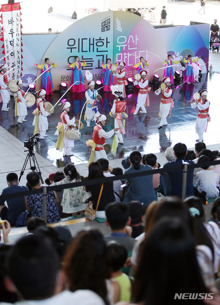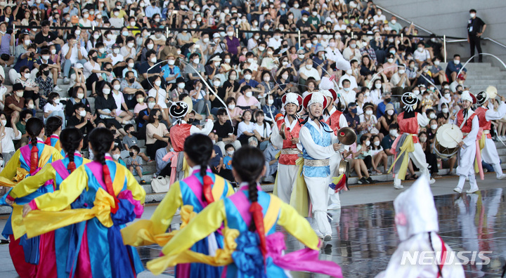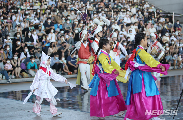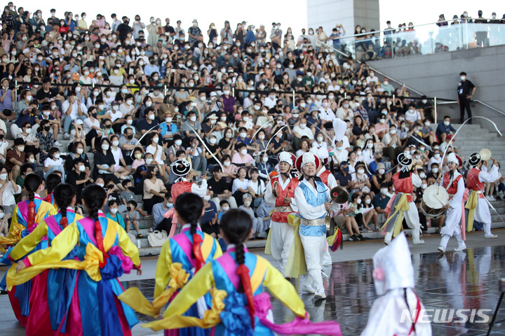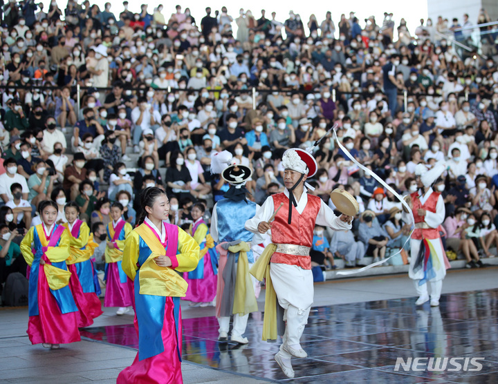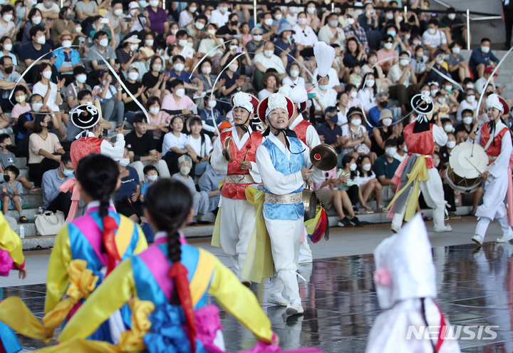 秋夕(中秋節。今年は9月10日)の連休初日に当たる9日の午後、ソウル市竜山区の国立中央博物館で、安城市立男寺堂パウドギ風物団が公演を行っているところ。