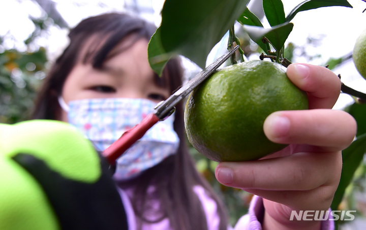 【NEWSIS】9日午後、大邱市東区のミカン農園で、収穫体験をする家族連れ。大邱でもミカンの栽培に成功した。大邱で亜熱帯果樹栽培が可能になっただけでなく、済州島を除く他地域より栽培経費を削減でき、農家の競争力も高いとのことだ。
