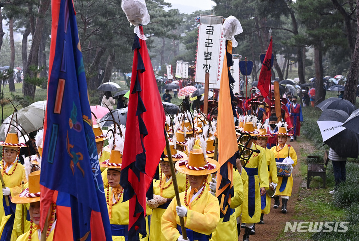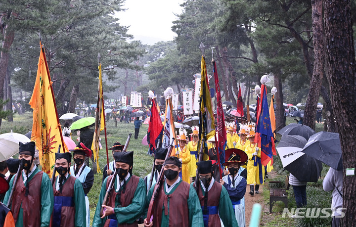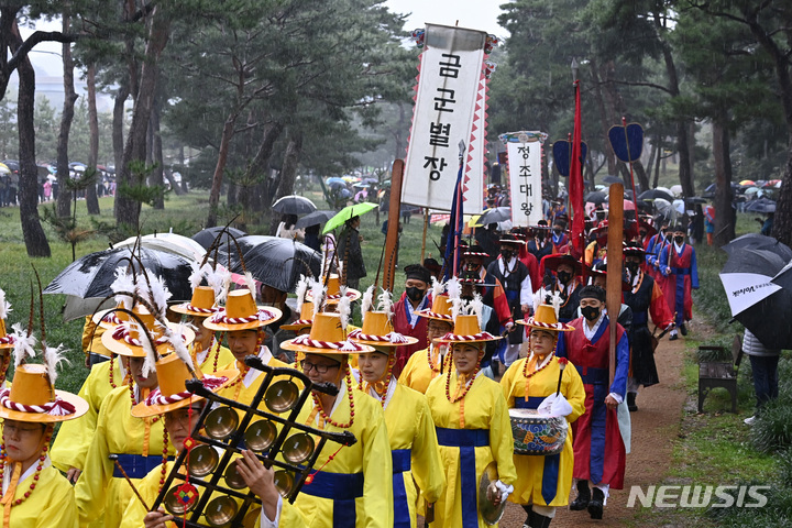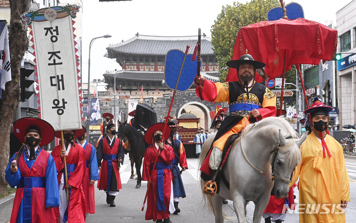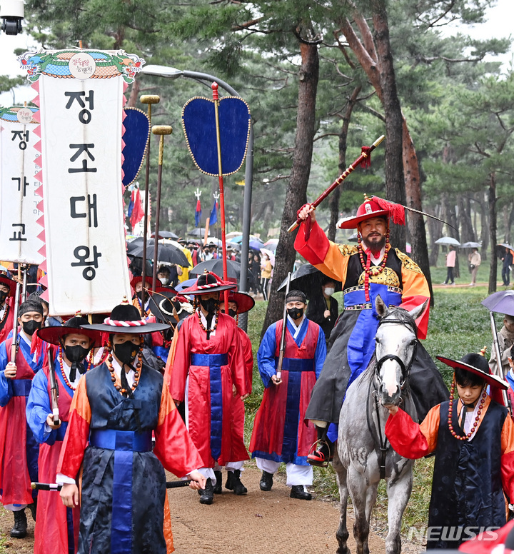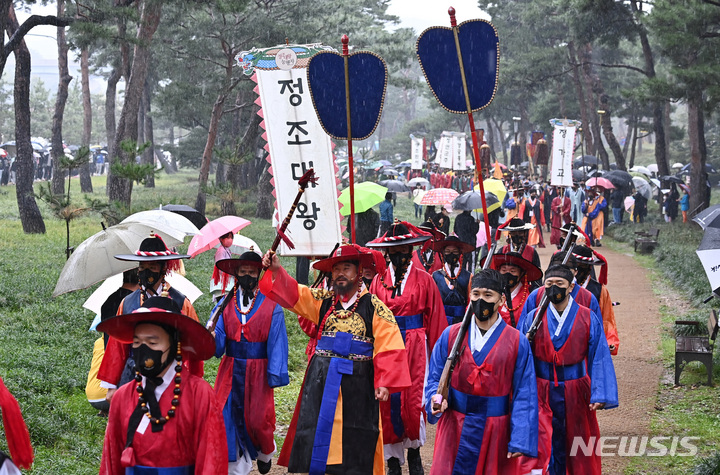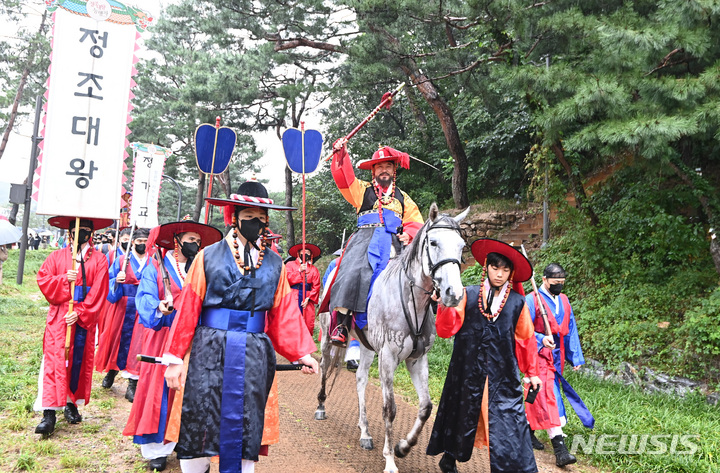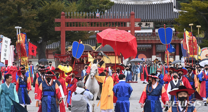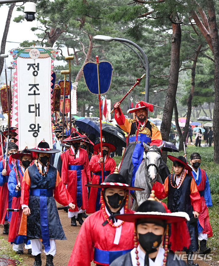 【NEWSIS】9日、京畿道水原市長安区の老松地帯を通る「2022正祖大王陵行次共同再現行事」の行列。「正祖大王陵行次」とは、1795年に正祖大王が母と共に、父・思悼世子の墓参りに行くための8日間の行列を再現したものだ。2018年以来4年ぶりに行われた今回の正祖大王陵行次再現行事は、ソウル・昌徳宮から水原市華城を経て隆陵まで約59キロメートルの区間を正祖、官吏、将帥、兵士らに扮(ふん)した約2900人が歩いた。