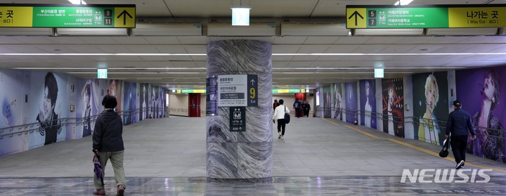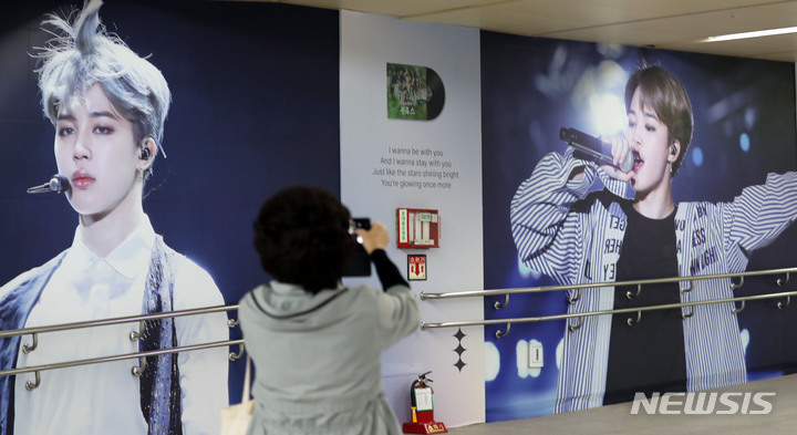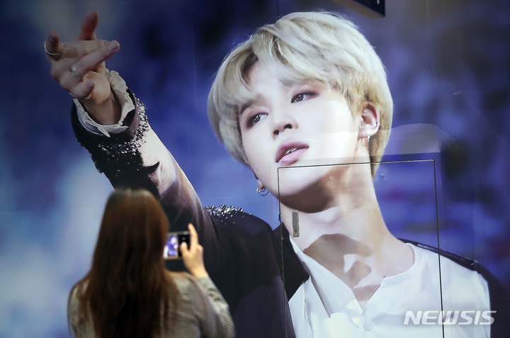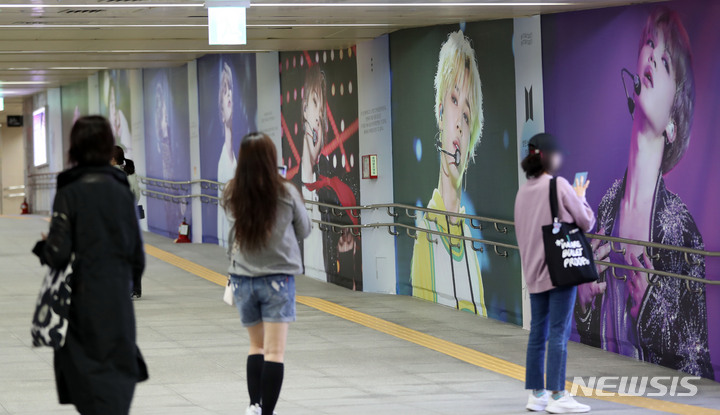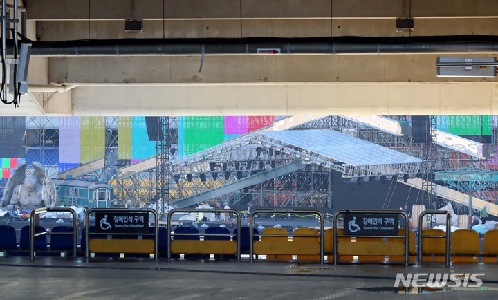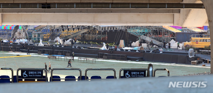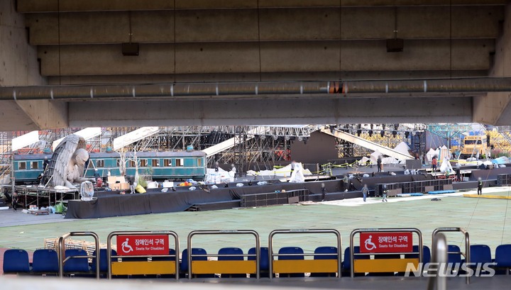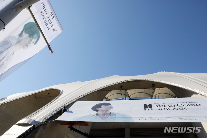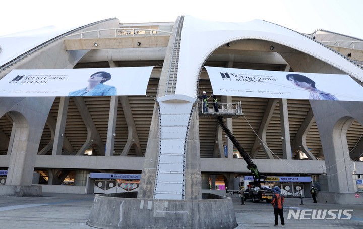 2030釜山世界博覧会(万博)誘致を祈る防弾少年団のコンサートが四日後に迫った11日、釜山市蓮堤区の釜山アジアド主競技場で、大型の垂れ幕の設置作業が行われている様子。今回の防弾少年団のコンサートは今月15日午後6時から、釜山アジアド主競技場で開かれる。