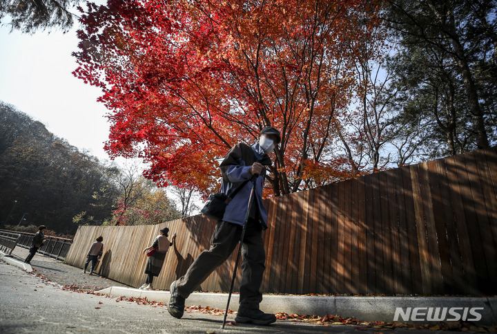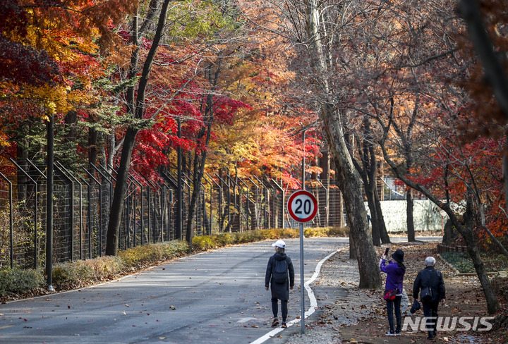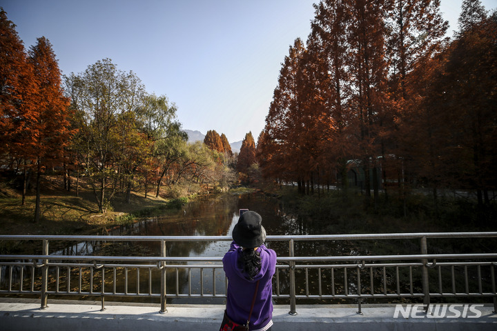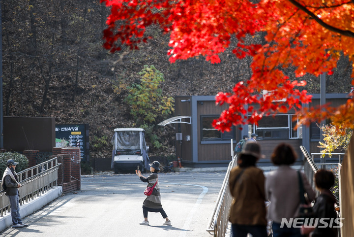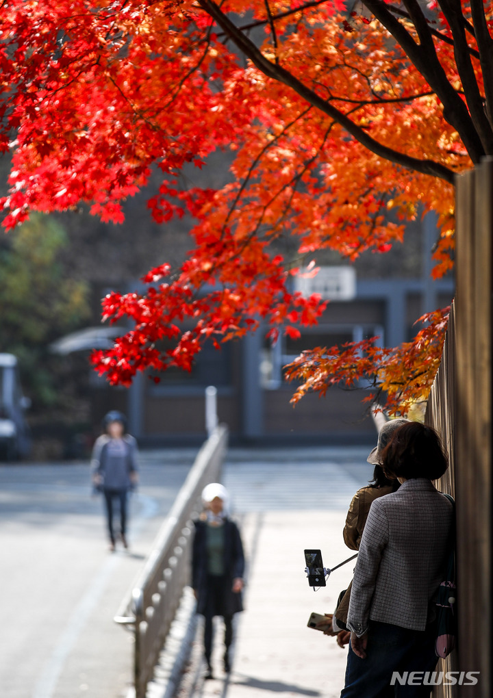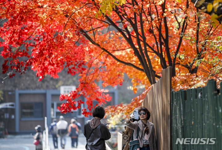 11日午後、京畿道果川市のソウル大公園を訪れた市民が、モミジの下で記念撮影をしている様子。