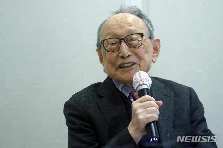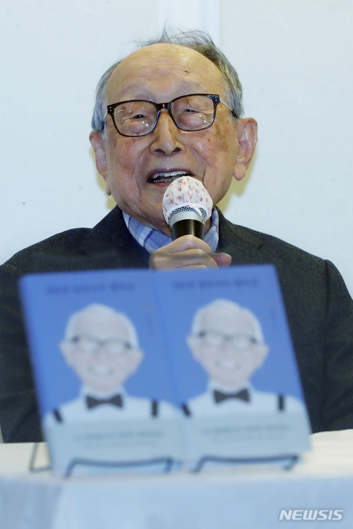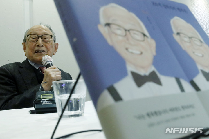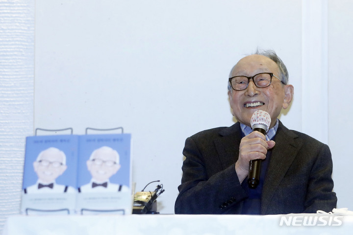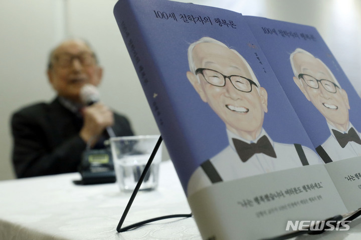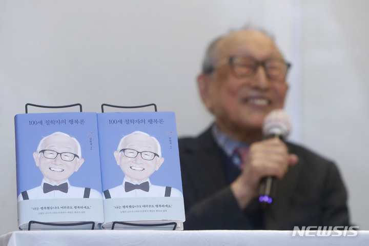 現在102歳の金亨錫(キム・ヒョンソク)延世大学哲学科名誉教授が2日、ソウル市鍾路区の世宗文化会館でエッセイ『100歳の哲学者の幸福論』出版記念懇談会に臨んだ。