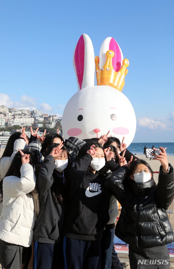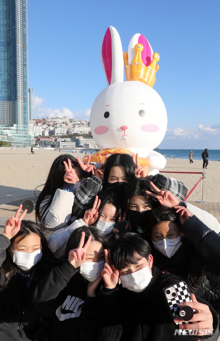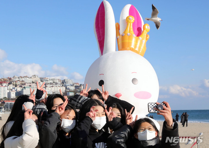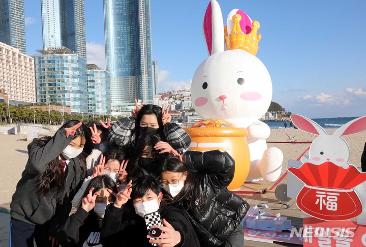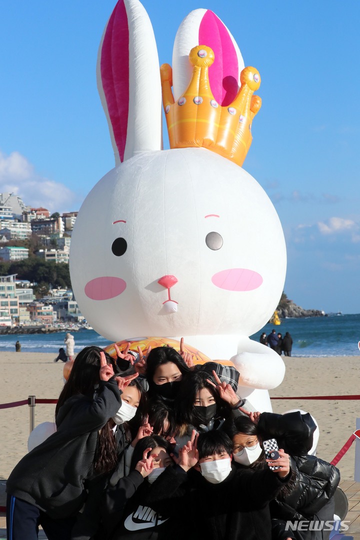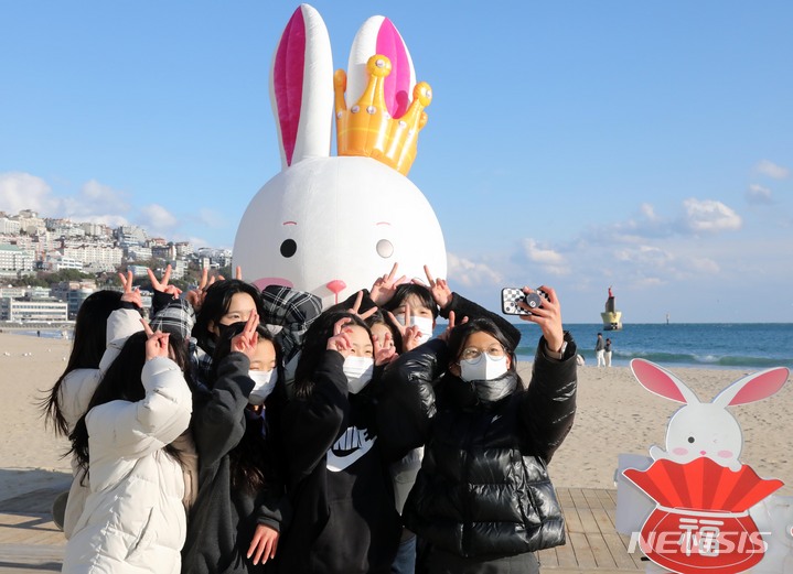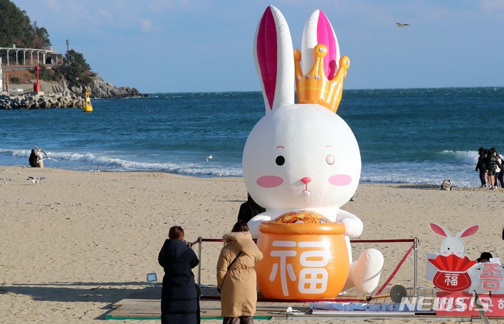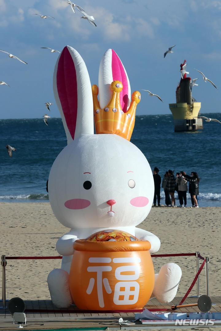 癸卯(みずのとう)年の2023年を前に、釜山市海雲台区の海雲台海水浴場の砂浜に22日、ウサギの造血物が設置され、注目を集めている。海雲台および松亭海水浴場に設置されたこのウサギは高さ5メートル、幅3メートルのバルーンタイプの造形物だ。