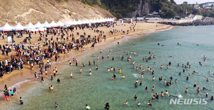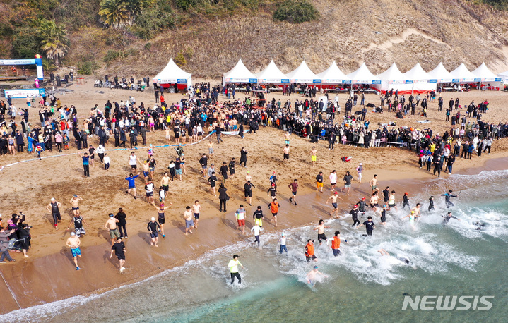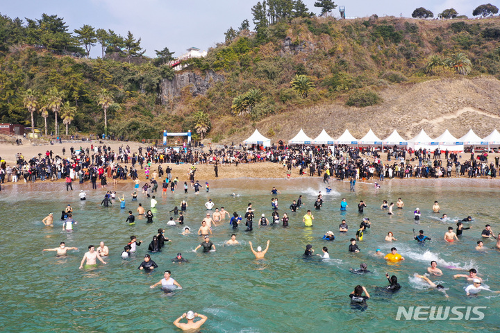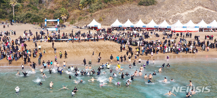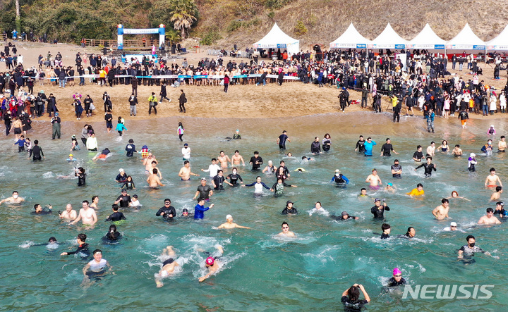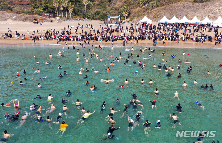 【NEWSIS】2023年の元旦、済州特別自治道西帰浦市内の中文穡達海水浴場で、「第24回国際ペンギン水泳大会」の参加者たちが冷たい海水に飛び込み、希望あふれる2023年を迎えた。