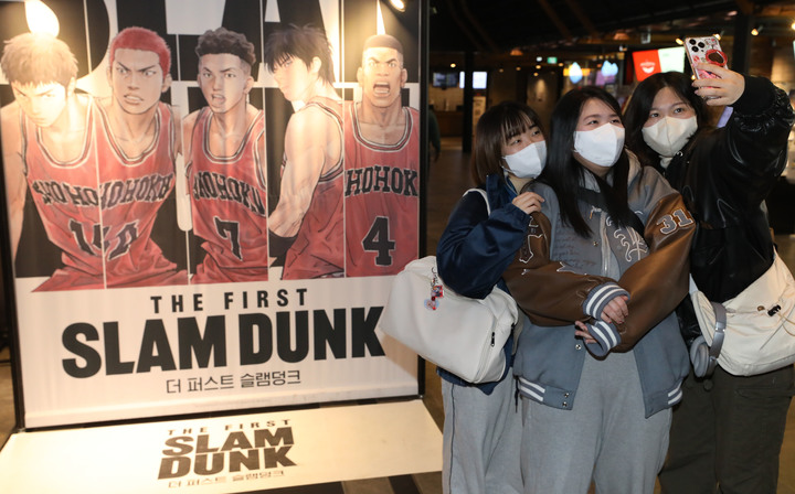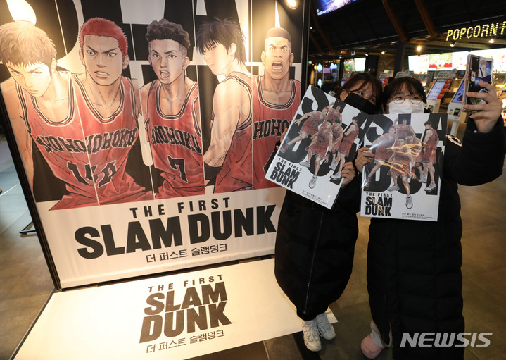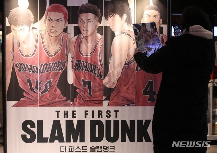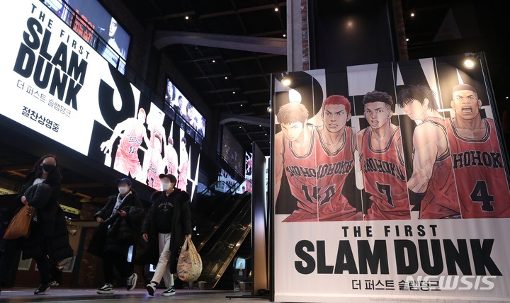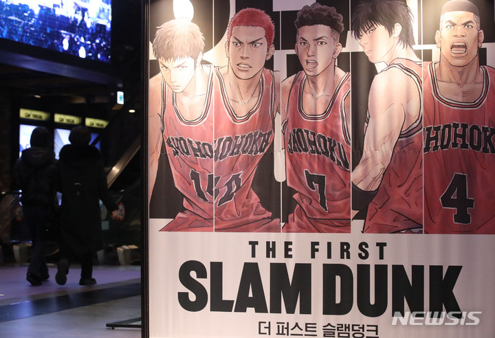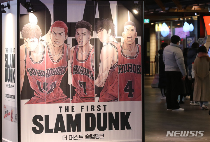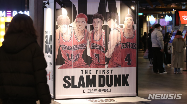 アニメ映画『THE FIRST SLAM DUNK』が、公開14日目の今月17日までの時点で、累積観客数101万3240人を記録した(18日、映画振興委員会映画館入場券統合ネットワーク調べ)。写真は18日、ソウル市竜山区の映画館「CGV竜山アイパークモール店」に掲示された『THE FIRST SLAM DUNK』のポスター。